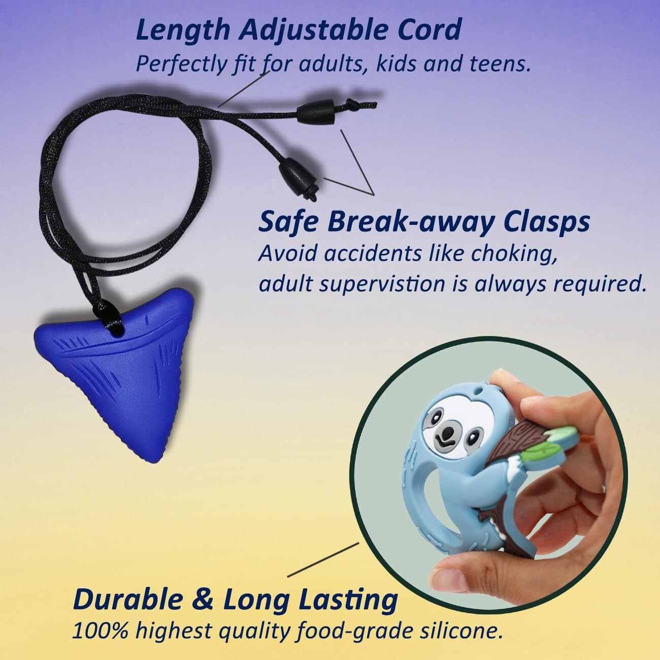 Complete Set: Includes 6 unique patented chew necklaces — Sloth, Shark Tooth, Donut, Mace, Twist, and Feather. There’s a favorite for everyone!
