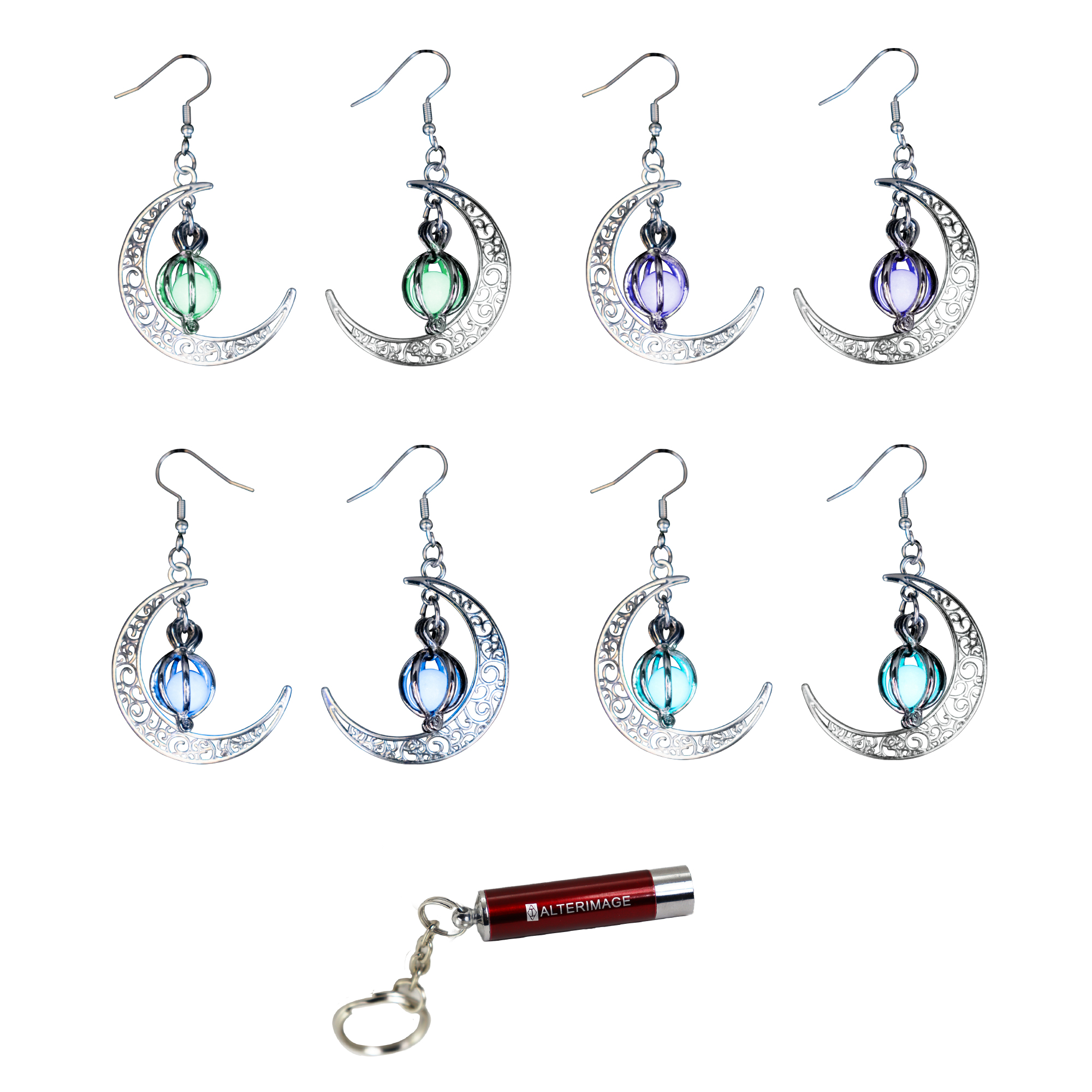 Ever dreamed of carrying a piece of the night sky with you? The AlterImage Alluring Crescent Moon Glow-In-The-Dark Earrings make that dream come true. Designed for lovers of celestial beauty, fantasy enthusiasts, and anyone who craves unique jewelry, these enchanting earrings add a magical glow that transforms your look from ordinary to extraordinary. Featuring a delicate crescent moon adorned with intricate filigree patterns, these earrings exude elegance and charm. At their heart lies a glowing orb inside a heart-shaped cage, soaking up light during the day to emit a mesmerizing glow at night. Choose from 4 stunning shades like blue, sky blue, green, or purple, each radiating a mystical vibe that’s sure to catch the eye and spark curiosity. Comfort meets style with these lightweight yet durable earrings, perfect for all-day wear. They effortlessly complement casual, boho, gothic, or fantasy-inspired outfits, making them the ultimate versatile accessory. Whether you’re heading to a festival, cosplay event, Halloween party, or just a night out, these earrings add a whimsical touch that’s bound to get compliments. No need to worry about the glow fading! Simply let them recharge in sunlight or use the included UV light keychain for an instant boost. You’ll always have a radiant glow ready to light up your evening. These earrings are perfect for birthdays, holidays, anniversaries, or any occasion that calls for a touch of wonder. Ideal for those who love mystical, witchy, or steampunk aesthetics, they’re a gift that truly stands out and surprises. Step into a world of celestial beauty and let your style shine with the AlterImage Crescent Moon Glow-In-The-Dark Earrings. More than just jewelry, they’re a gateway to a universe of elegance, mystery, and magic.