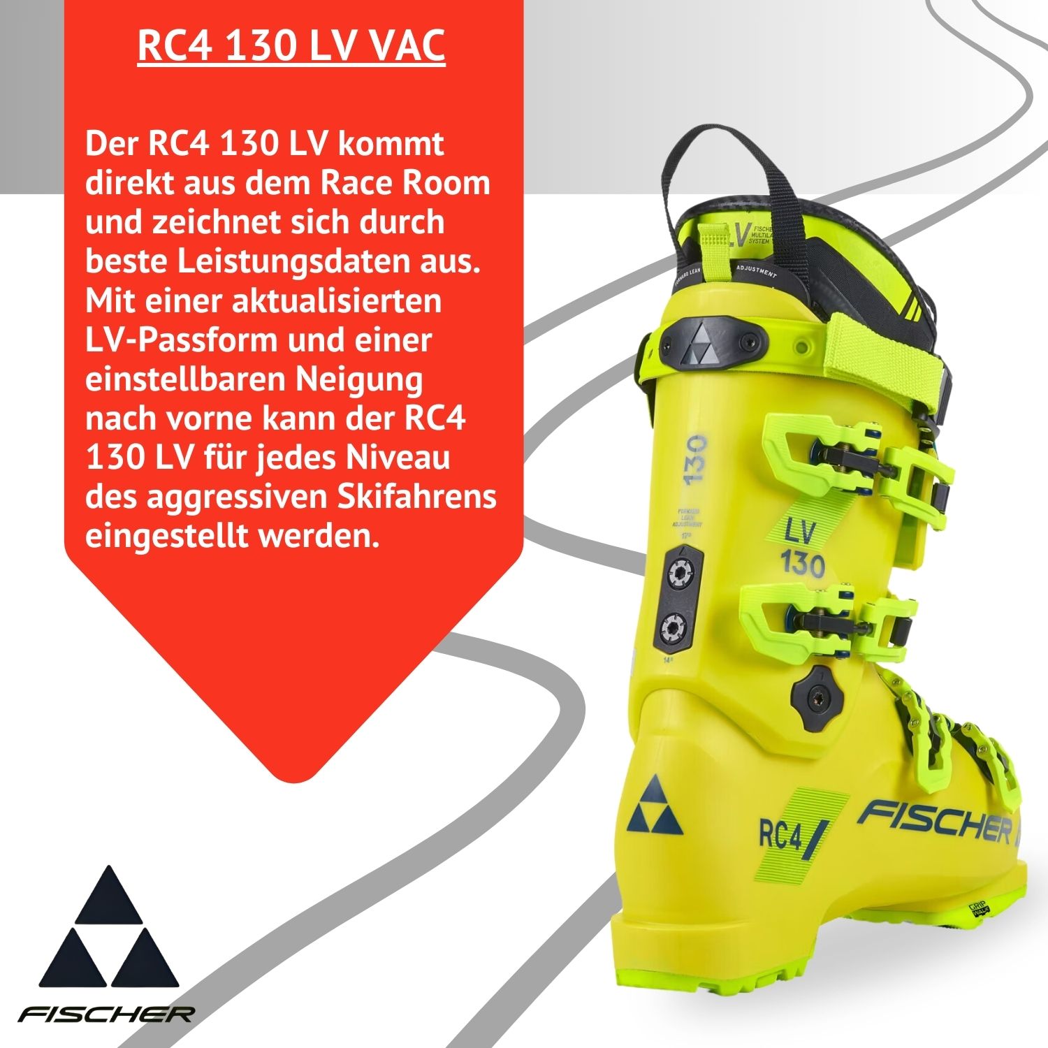 - Der RC4 130 LV kommt direkt aus dem Race Room und zeichnet sich durch beste Leistungsdaten aus. Mit einer aktualisierten LV-Passform und einer einstellbaren Neigung nach vorne kann der RC4 130 LV für jedes Niveau des aggressiven Skifahrens eingestellt werden.