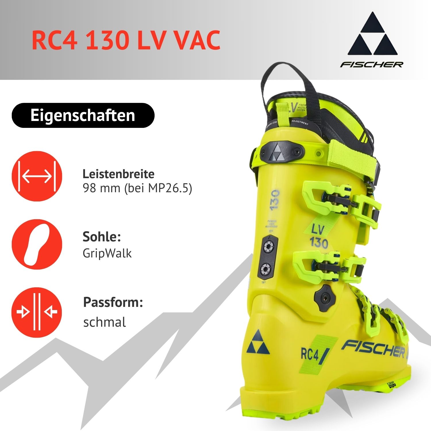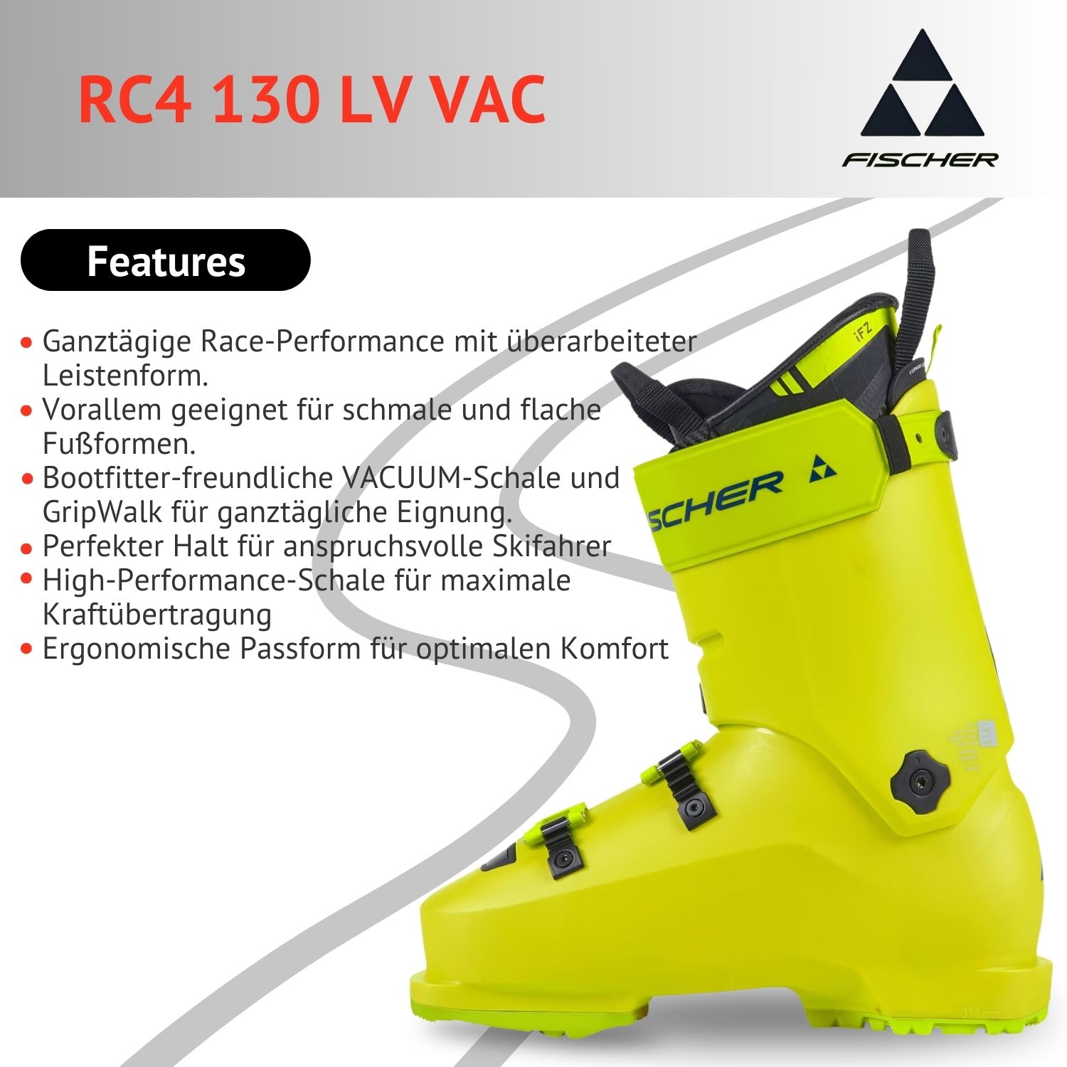 - Ganztägige Race-Performance mit überarbeiteter Leistenform. Vorallem geeignet für schmale und flache Fußformen. Bootfitter-freundliche VACUUM-Schale und GripWalk für ganztägliche Eignung. Perfekter Halt für anspruchsvolle Skifahrer. High-Performance-Schale für maximale Kraftübertragung- Ergonomische Passform für optimalen Komfort