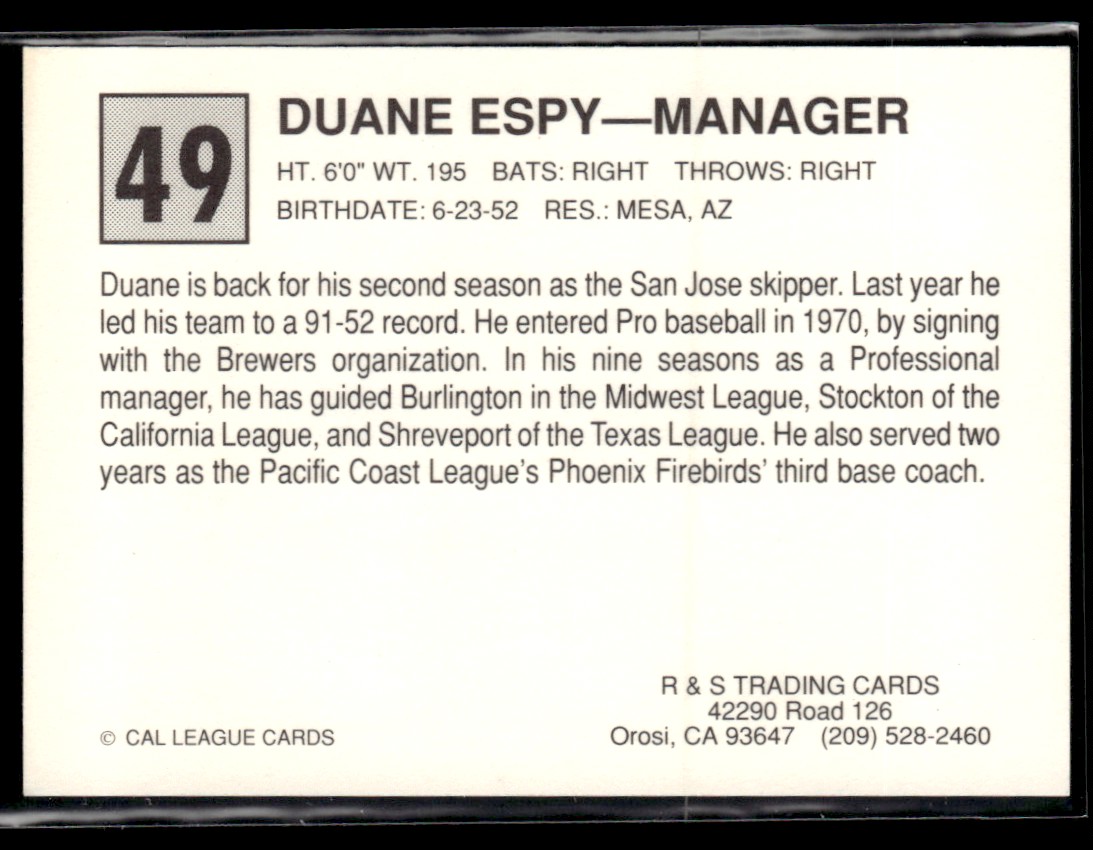 | 1989 Cal League All-Stars Duane Espy San Jose Giants #49 |