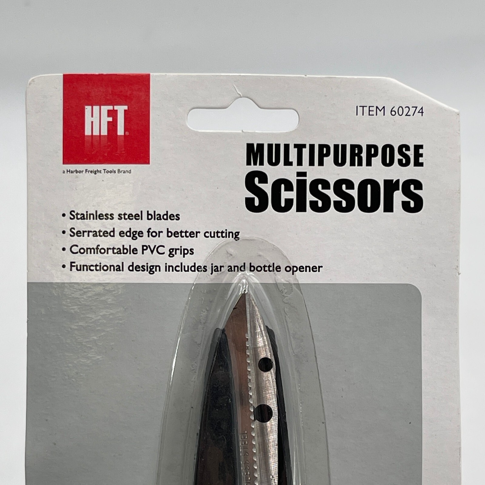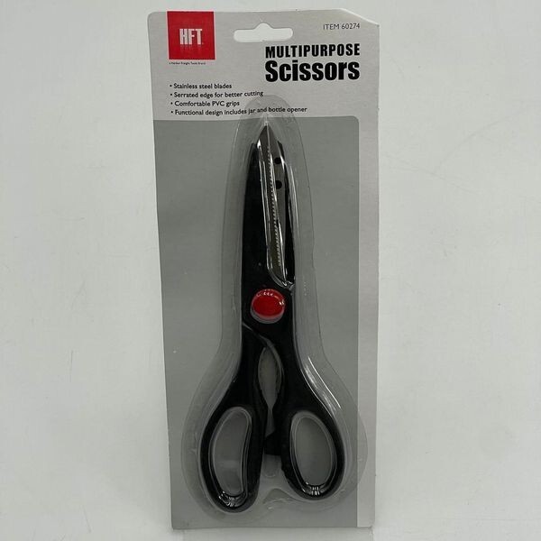 These multipurpose scissors feature heavy-duty stainless steel blades with serrated edges.