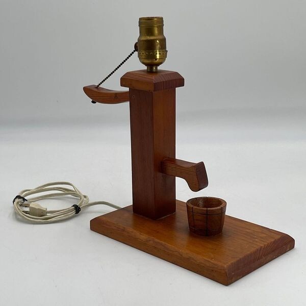This vintage wood well pump electric table lamp features a rustic design with a water pump theme.