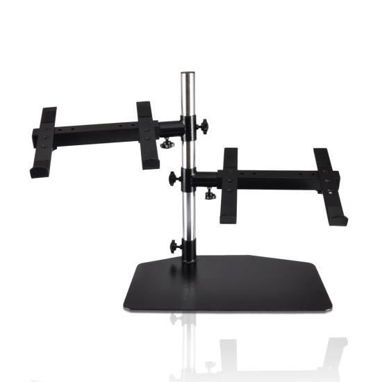 Reach new levels in your music performance, and gain convenient access to your gear, with the Pyle PLPTS45 Dual Device Tabletop Studio Equipment Stand. It's the heavy duty solution to hold all your audio equipment. The dual device mount holder arms are height adjustable and can raise or lower your gear from 3.5" to 15.7". Universal bracket arms are also width adjustable so it can hold devices like laptops, mixers, turntables and more. Enjoy 360 degree full rotation swivel adjustments along with device tilting ability. This heavy-duty tabletop stand provides rugged and reliable performance -- all within arm's reach! Adjust, position and angle your equipment exactly where you need it, and achieve optimum performance with the Pyle PLPTS45 Dual Studio Equipment Stand.