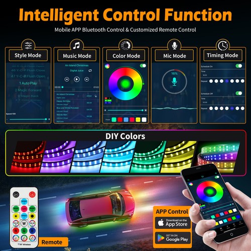 CONTROL METHODS -underglow lights adopts three controller designs, which can be controlled by the control box, RF, and mobile phone according to the needs. It has 8 preset static lights, 4 flashing scenes, and 4 sound activation modes. The control is sensitive, and a variety of colors provide switching , The controllable range reaches 100 feet.