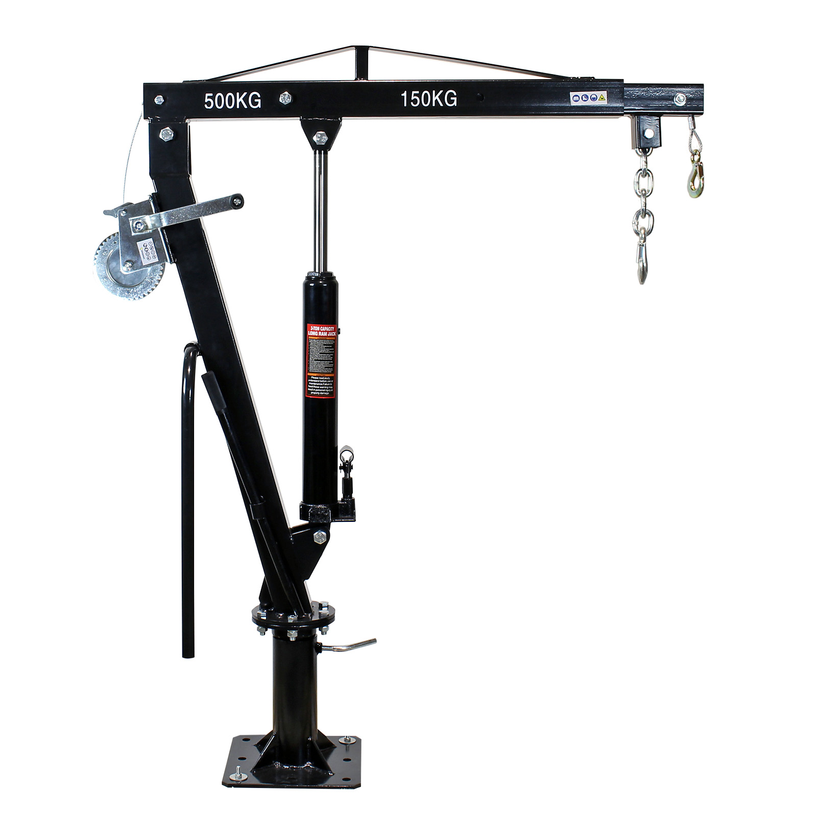 Damit der Pickup Kran einen sicheren Halt liefert, befinden sich im Standfuß vorgebohrte Löcher. Diese können für eine Bodenbefestigung genutzt werden, sodass der Ladekran nicht umkippen kann. Es ist zum Beispiel eine Montage auf der Ladefläche des Pickups möglich. Die Seilwinde mit großer Zugkraft erleichtert Ihnen das Lastenheben und ermöglicht auch eine Lastenaufnahme direkt vom Boden.