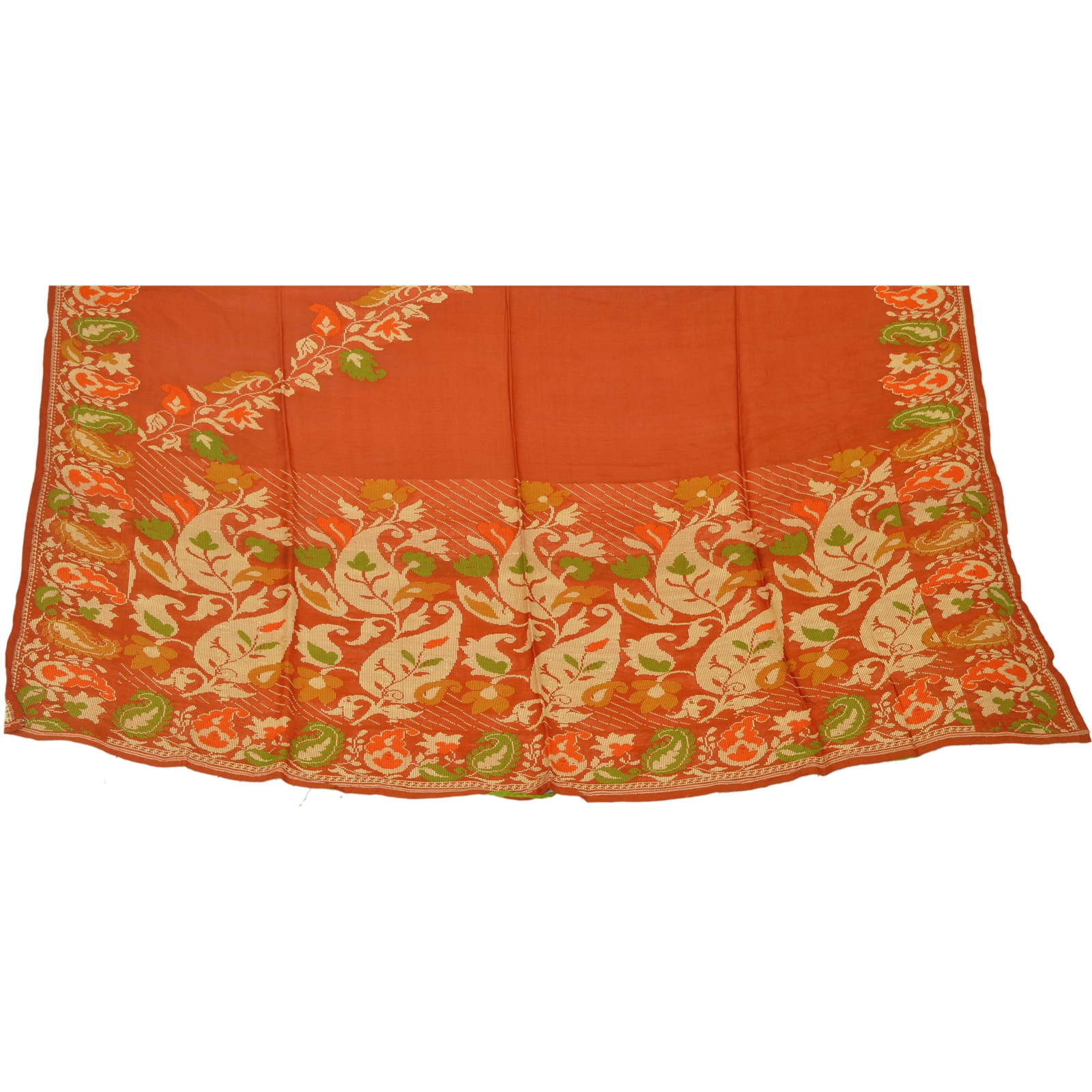 Stunning Hand Woven Design Fabric In Pure Silk . Amazing Green, Orange & Cream Weaving Work Is Looks Awesome. Awesome Floral & Paisley Design Is Really Enhancing The Beauty Of The Fabric.