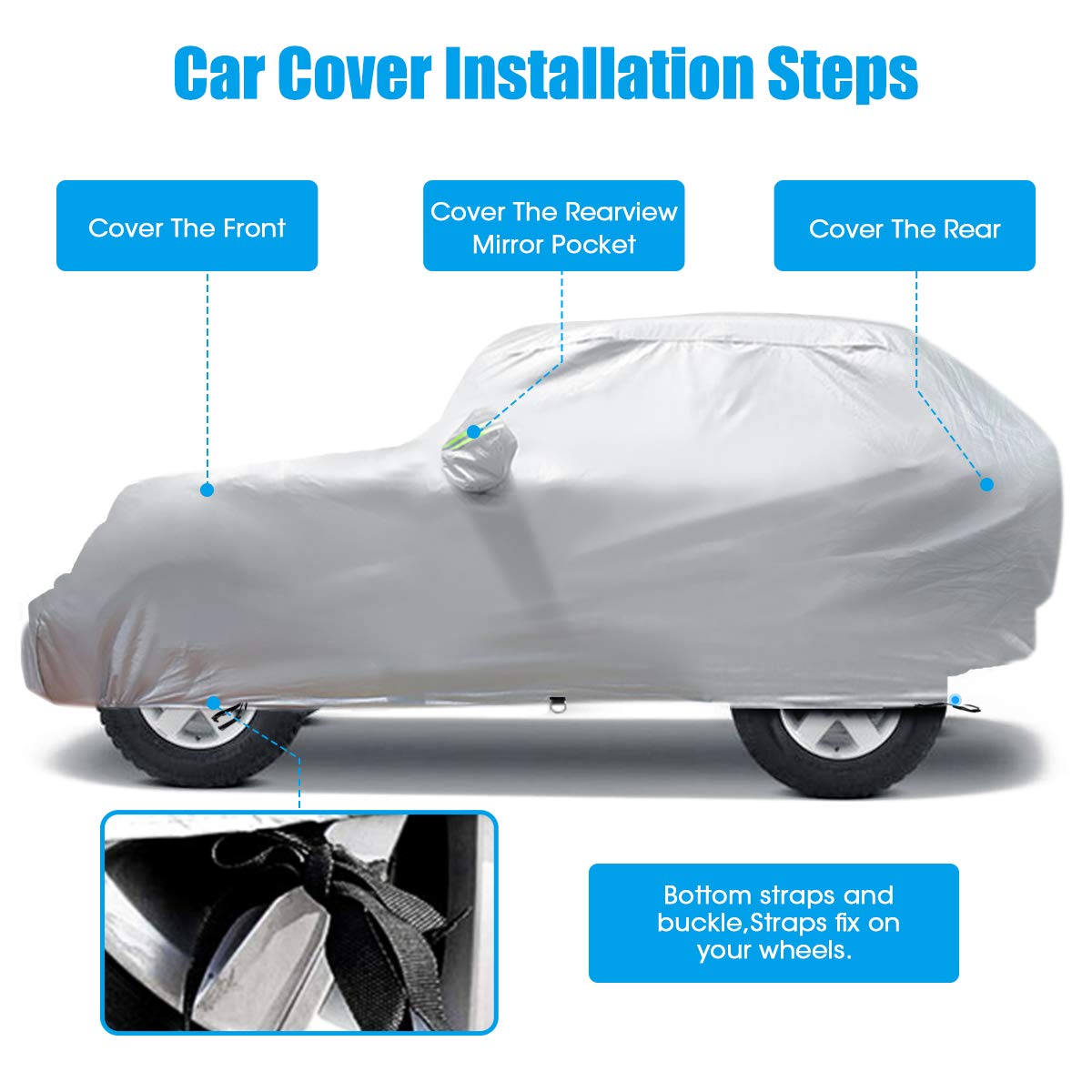 -Driver Door Zipper provides easy access to the car. UV Protection Car Cover effectively block sun's UV rays on surface and interior of car AND with 4 Reflective Stripes warning people in night.