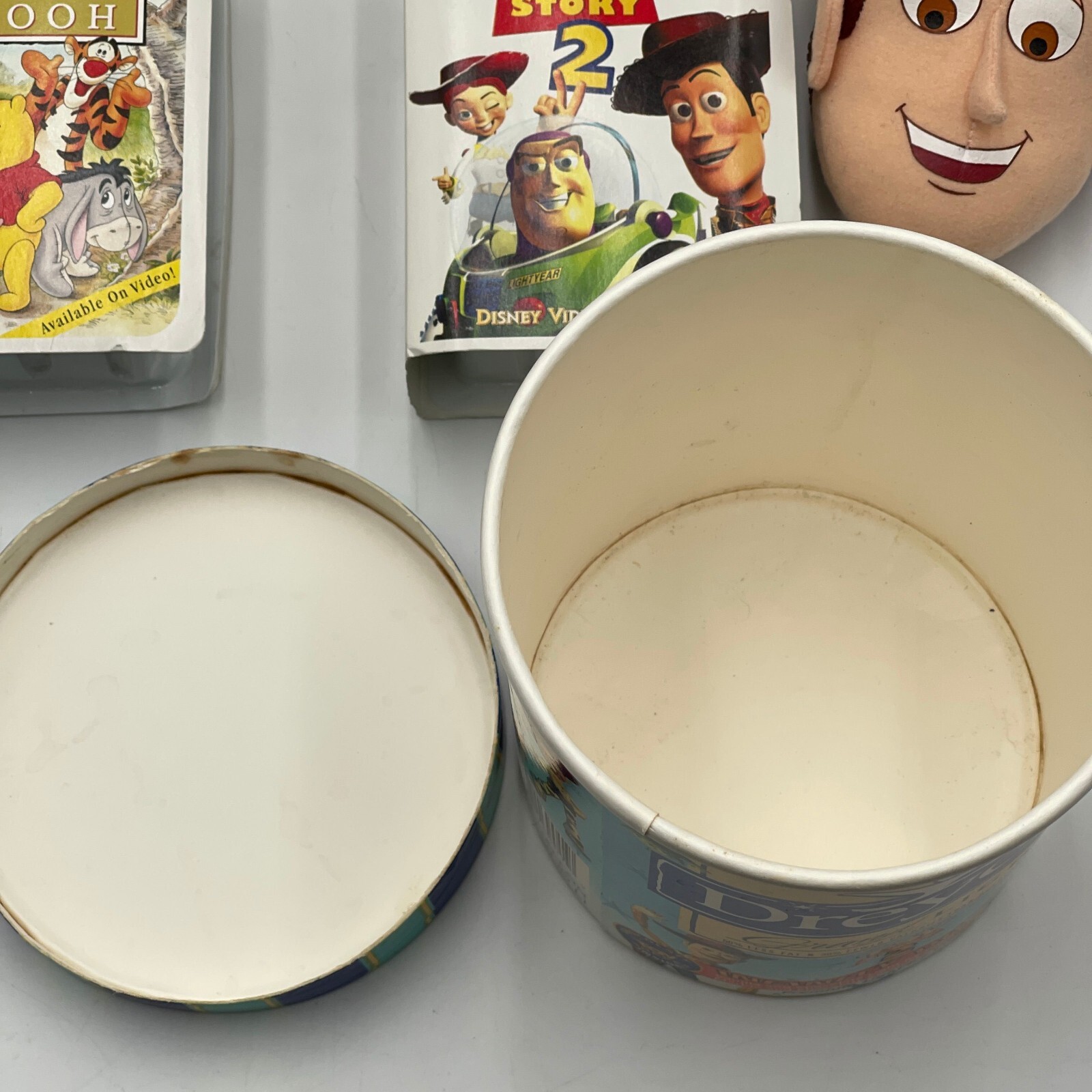 The product is a vintage Disney Pixar Toy Lot featuring a large 11.5" Toy Story tin filled with various collectible items.