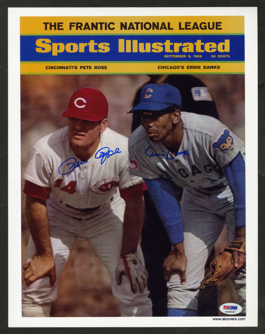 I have available this 11" x 14" Sports Illustrated Cover Print that has been signed by legendary Cincinnati Reds (Future HOF) Pete Rose and Hall of Famer Chicago Cubs Ernie Banks. Mr. Rose and Mr. Banks signed this print for me IN PERSON. This SI Cover Print was purchased directly from Sports Illustrated themselves and I then had Mr. Rose and Mr. Banks sign the print. To purchase the unsigned print alone, SI.com charges $20.00 not including postage. This print was professionally developed and printed on Kodak type paper and is in BRAND NEW/NEVER BEFORE DISPLAYED CONDITION.