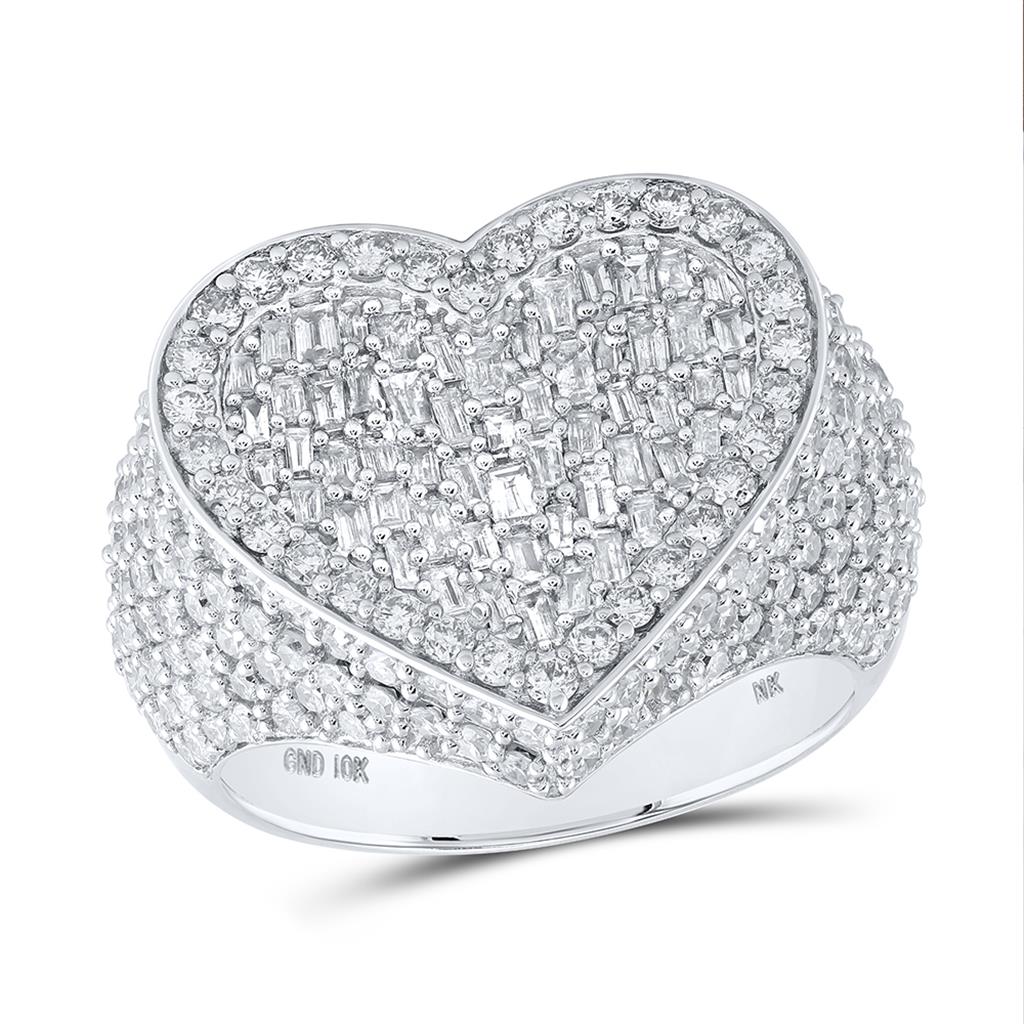This exquisite diamond Heart Cocktail Ring, casted in 10k White Gold. Radiant with 2.75 ct. t.w. of Baguette & Round cut diamonds and high polished to a bright lustrous shine. This statement ring will sparkle for a lifetime, a look she'll always treasure. Diamonds are Prong set in-between the White Gold mounting to securely fasten the diamonds. The diamonds are hand set precisely to give it a smooth uniform flow. Solid mounting, the ring weighs approx. 8.53 gr. All diamonds in this ring are matching in clarity and color. Currently this ring is ladies size 7, if you would like this ring in a different size please message us, for resizing charges and we will get back to you right away. This ring can be sized at your local jeweler as well.
