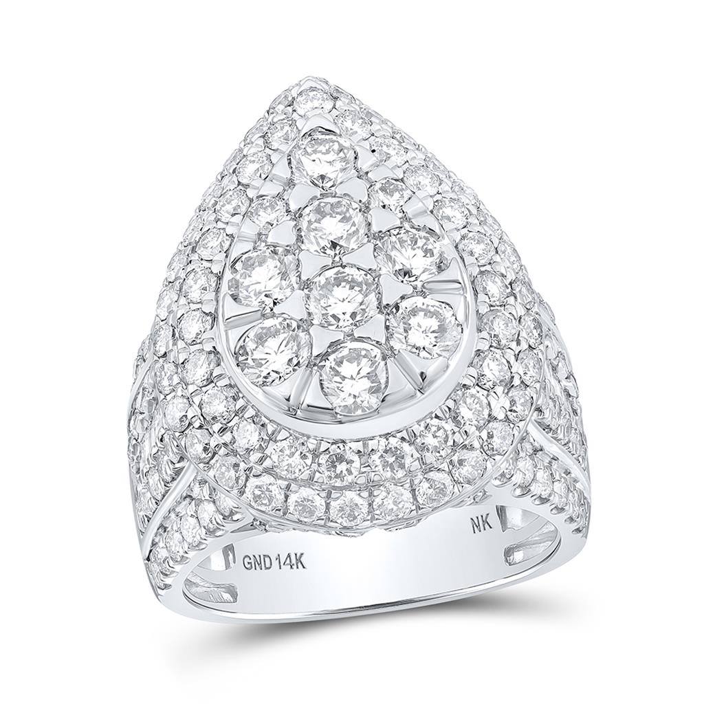 This exquisite diamond Domed Double Teardrop Halo Cocktail Ring, casted in 14k White Gold. Radiant with 4 ct. t.w. of Round cut diamonds and high polished to a bright lustrous shine. This statement ring will sparkle for a lifetime, a look she'll always treasure. Diamonds are Prong set in-between the White Gold mounting to securely fasten the diamonds. The diamonds are hand set precisely to give it a smooth uniform flow. Solid mounting, the ring weighs approx. 11.89 gr. All diamonds in this ring are matching in clarity and color. Currently this ring is ladies size 7, if you would like this ring in a different size please message us, for resizing charges and we will get back to you right away. This ring can be sized at your local jeweler as well.