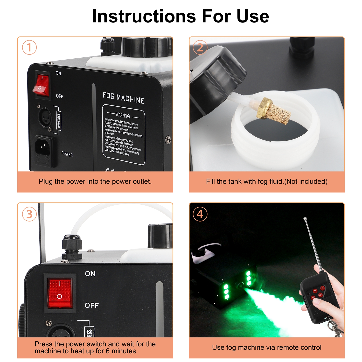 1. Install the atomized liquid and tighten the container lid. After connecting the power supply and the signal receiver, turn the switch to "ON", and the machine will start heating. After the heating is completed, the fog machine can be controlled by the wireless remote control to spray.