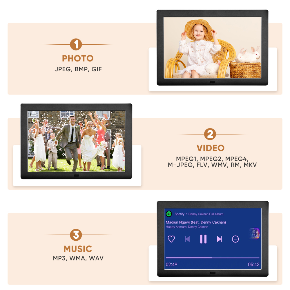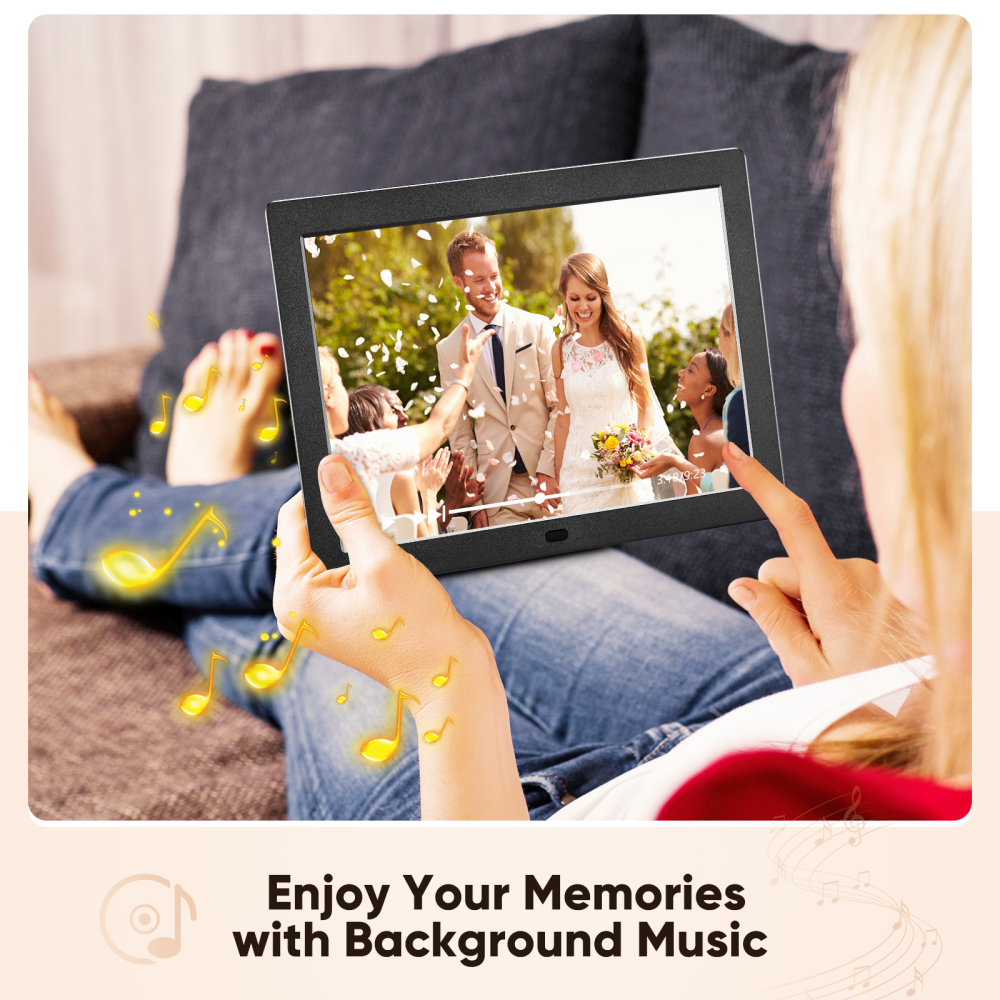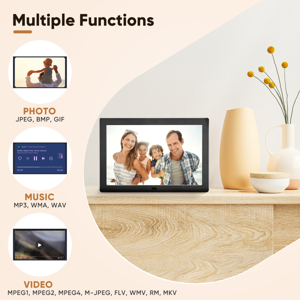 【 Zeigt klare Bilder 】 Sie können mit dem 20,3 cm großen Fotorahmen empfindlichere Bilder erhalten, da er eine hohe Auflösung von 1920*1200 und ein Seitenverhältnis von 16:10 hat. IPS-Display bietet Ihnen einen 178° breiten Betrachtungswinkel und präsentiert klare und lebendige Bilder, bietet Ihnen ein angenehmes Bild-Browsing-Gefühl und Videoansicht.