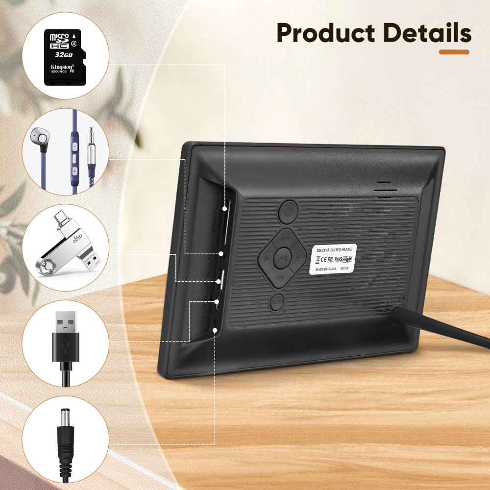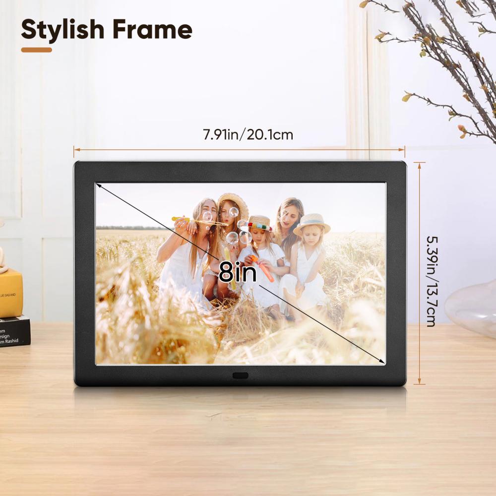 【Stilvoller Rahmen】 Dieser digitale Bilderrahmen in klassischem Schwarz ist Ihre beste Wahl für Büro, Wohnzimmer oder Schlafzimmer. Es nimmt aufgrund seiner kompakten Struktur nicht zu viel Platz ein. Außerdem ist es auch ein ausgezeichnetes Geschenk für geliebte Menschen und Freunde mit farbiger Verpackung.