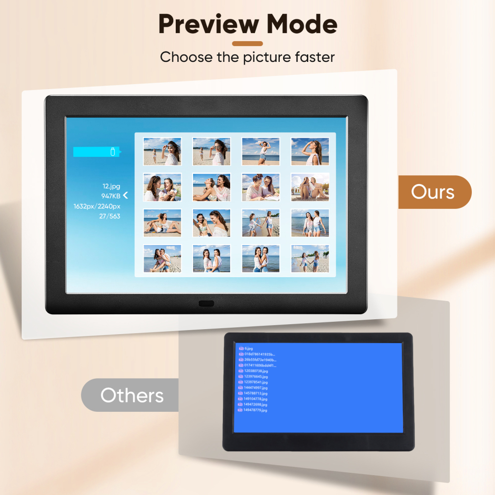 【Mehrere Funktionen】 Dieser digitale Bilderrahmen unterstützt das Browsen, Audio- und Videowiedergabe. Sie können den Vorschau-Modus verwenden, um schnell das gewünschte Bild auszuwählen. Sie können auch Ihre Erinnerungen mit Hintergrundmusik genießen, wenn Sie Bilder durchsuchen. Mit Kopfhöreranschluss und Stummschaltmodus, stört es nicht die Ruhe und die Arbeit.