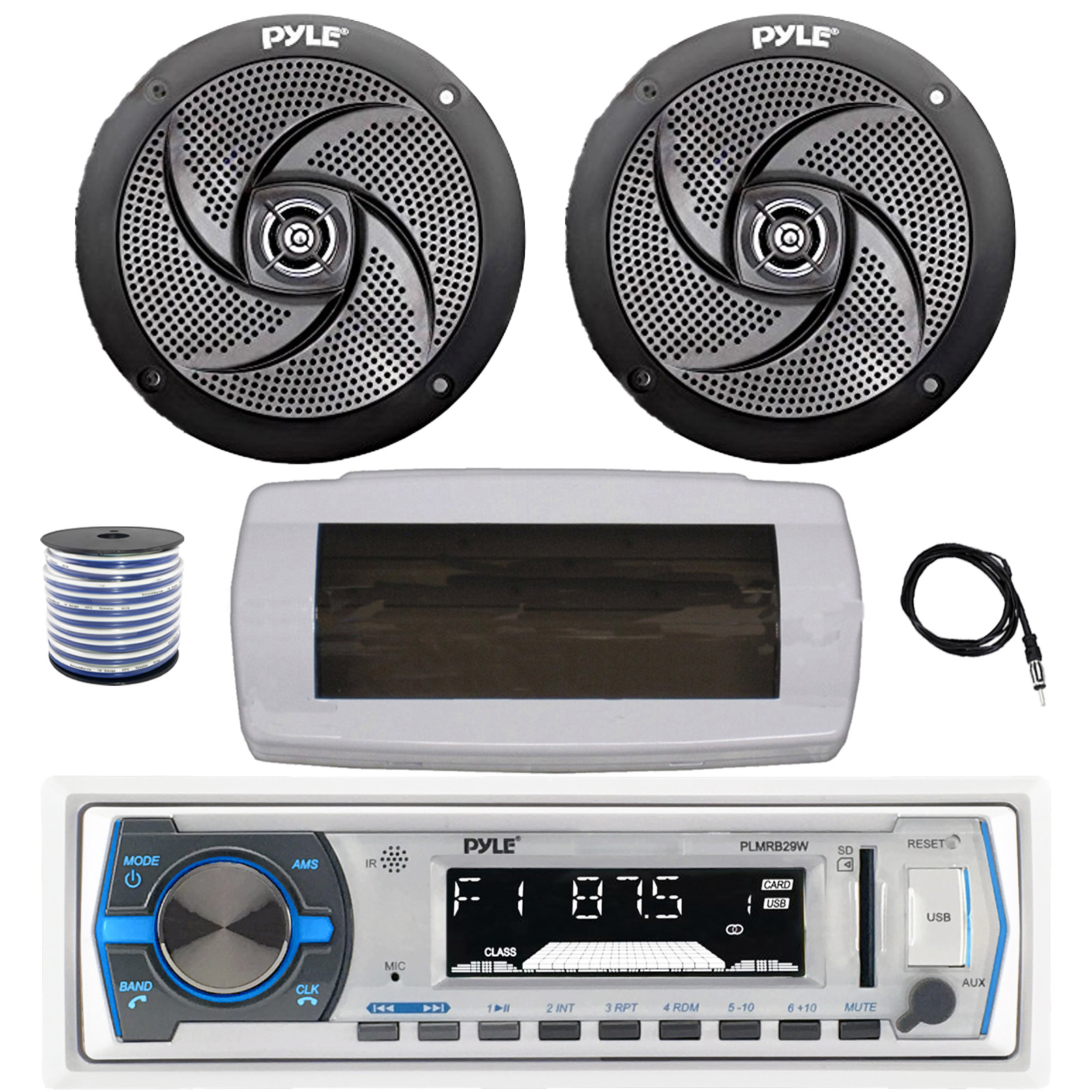 Pyle PLMRB29W Single DIN Bluetooth Marine MP3 AM/FM Stereo Receiver with White Cover, 22" Radio Antenna, Wire, 2x 6'' 240 Watt Max 2-Way Boat Audio Speakers (Black)