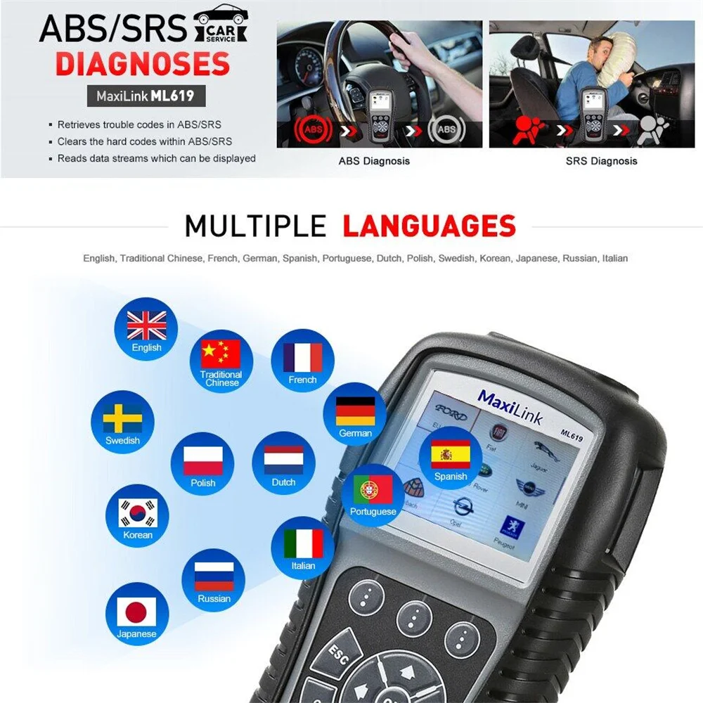 Autel MaxiLink ML619 is the perfect tool for detecting faults on vehicle Anti-Lock Brake (ABS) and Supplemental Restraint System (SRS)/Airbag systems, in addition to performing OBD II diagnostics.