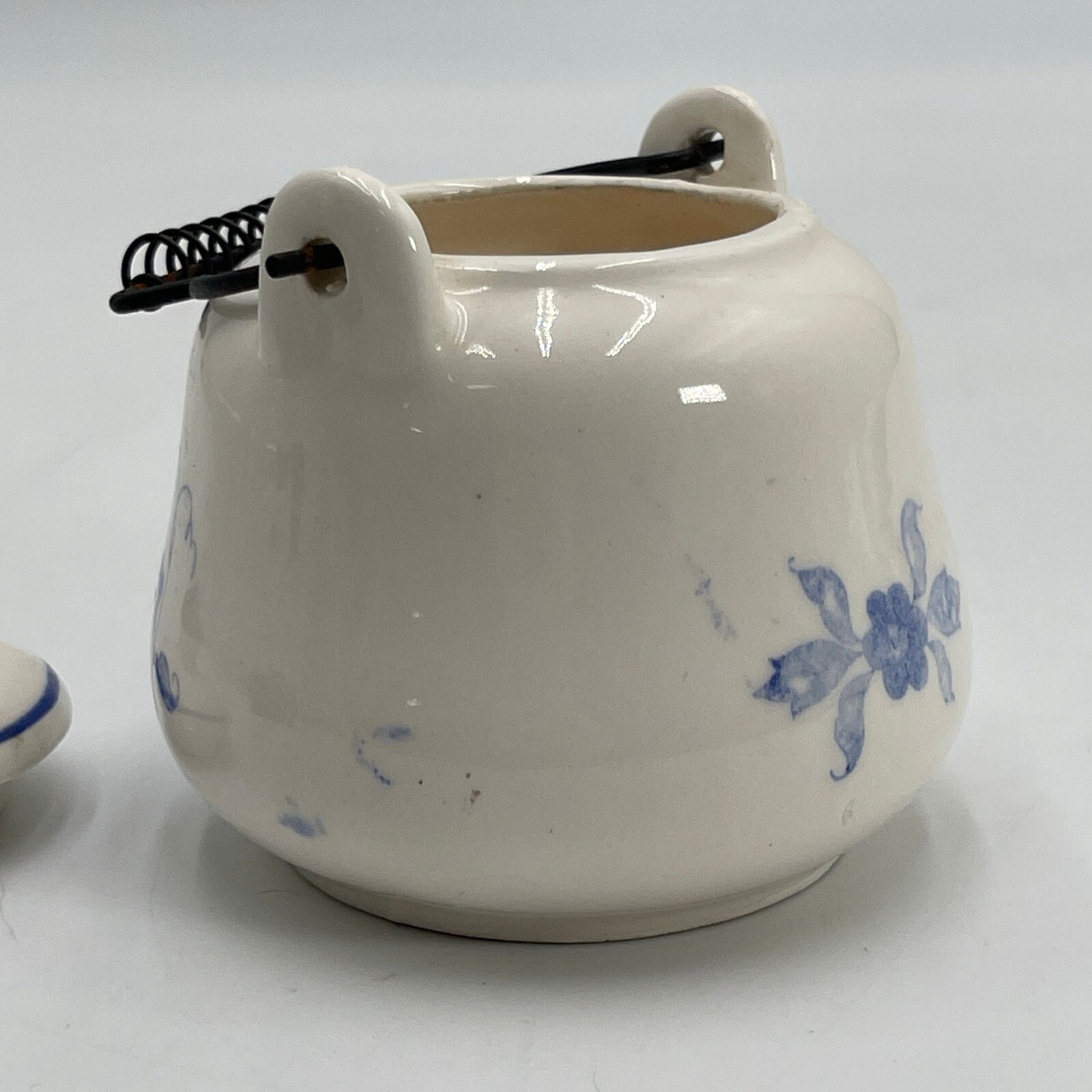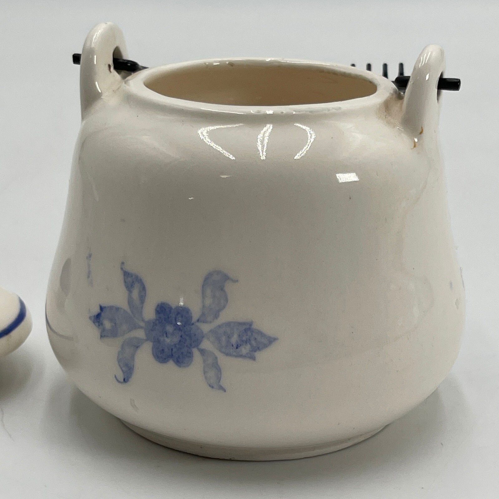This antique teapot features metal handles and a glossy finish. Made of glass, ceramic, or porcelain in Japan, it showcases a traditional Delft production style with a blue color theme and flower motif.