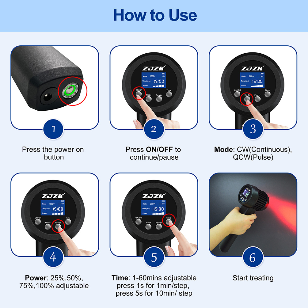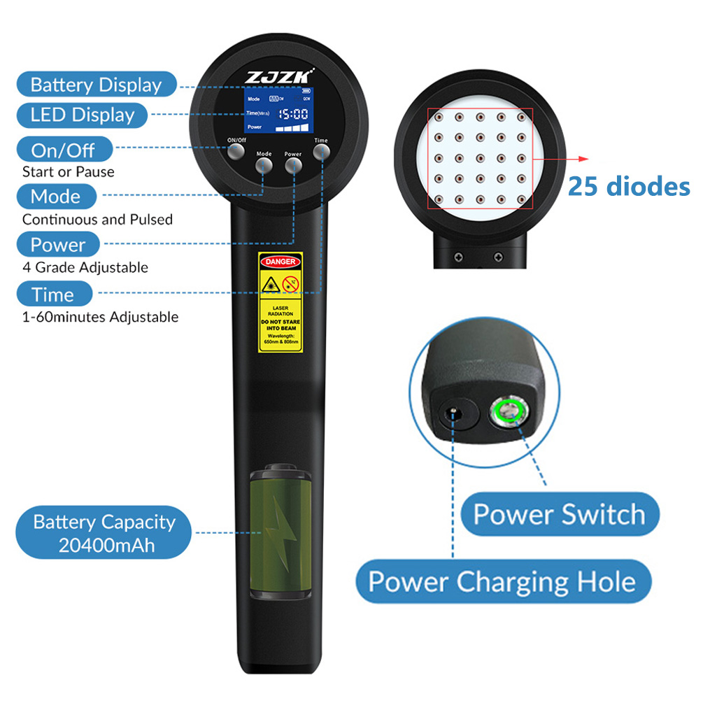 【Handheld Laser Pain Therapy at Home】Low Level laser therapy device is portable and rechargeable. Four Grades Power Adjustable (25%,50%,75%,100%) ;Two working modes Adjustable: Continuous Wave & Pulsed Wave ( There is evidence proven that PW is superior to CW for most application except nerve regeneration ). Time: 1-60 Minutes Adjustable. The screen can shows the functions clearly. 1-2 times a day for 10-15 min treatment. 20400mAh rechargeable battery.