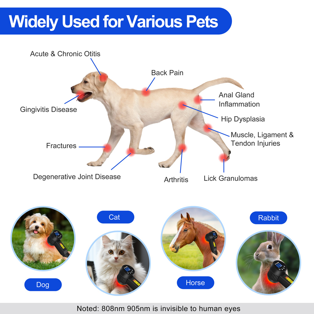 【Powerful Cold Laser Therapy】808nm laser therapy, also known as low-level laser therapy (LLLT) or cold laser therapy, is a non-invasive treatment that uses light at a wavelength of 808nm (near-infrared) to stimulate tissue healing, reduce pain, and promote cell regeneration. This wavelength is particularly effective because it penetrates the skin and tissue deeper than other wavelengths, making it ideal for treating musculoskeletal and deep tissue injuries in both humans and animals.