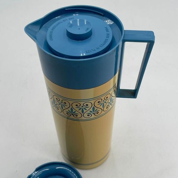The Genuine Aladdin Beverage Butler Blue & Cream Thermos is a stylish and versatile container lid featuring a two-tone color scheme with a blue top and harvest gold or mus.