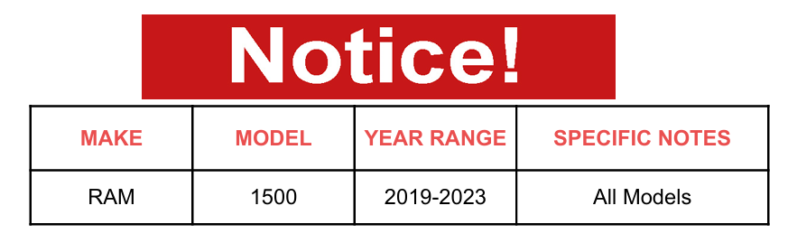 | Ram | 1500 | 2019-2023 | 4WD Models with 22 in Wheels |