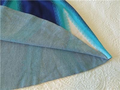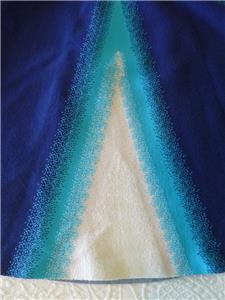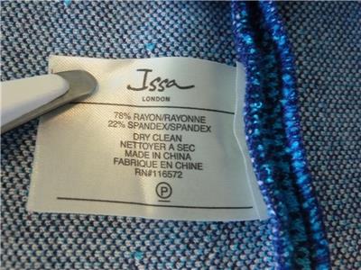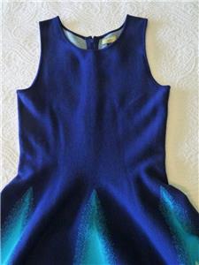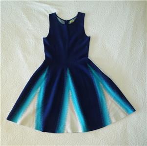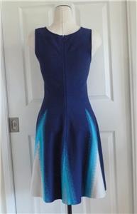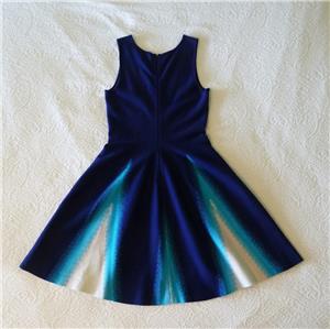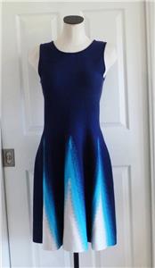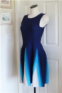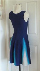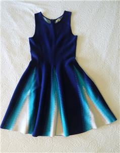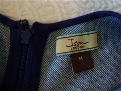 Stunning ISSA LONDON dress. Soft jacquard knit, 78% rayon, 22% spandex. Tag size Medium, seems good for a Small, please check measurements below to see if it will work for your desired fit. (Snug fit on my 35" bust mannequin). Flattering fit and full flare, silhouette, gently scooped neckline, hidden back zipper. Beautiful color block of royal-to-navy blue, turquoise and white, with subtly raised arrow stitches from one to the other that creates an ombre look. Hard to see, but just a hint of iced aqua in the center of the white triangles. Excellent condition. Best to review all 14 photos to fully appreciate. You will look and feel fabulous!