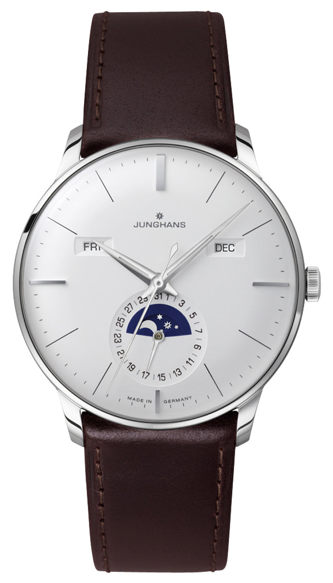 Like all of our watches, this Junghans Meister Kalender Datum Englisch Automatic Stainless Steel Silver-Tone Dial Brown Leather Strap Day/Date Month Moonphase Mens Watch is brand new and comes in its original packaging.