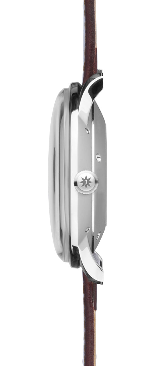 Holding a fascination over us, the earth's satellite, the Moon along with its phases, have always influenced man and his natural surroundings. This Meister Kalender features a 40.4 mm stainless steel case with a silver-tone dial under a scratch-resistant domed sapphire crystal. It has silver-tone and luminescent dauphine hands with applied silver-tone and printed black indices as hour markers. This is complemented by smoothly beveled apertures for day of the week (10 o'clock, in English), month (2 o'clock, in English), signed crown, pointer date, and a semi-circular moonphase aperture at the 6 o'clock position. It is fitted with a brown leather strap and secured with a stainless steel signed buckle. The exhibition caseback is held by 5 screws which showcases the caliber J800.3, an automatic full calendar movement beating at 28,800 vibrations per hour generating up to 38 hours of power reserve and is water resistant up to 50 meters/165 feet.