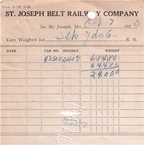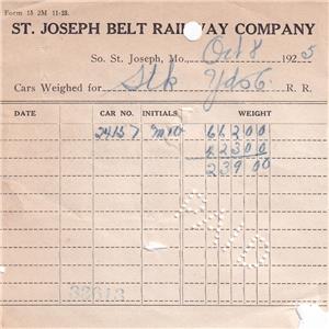 For auction are 2 "car weight" documents from the SJB dated October 1925. Each presents the weight of a freight car in route to the St. Joseph Stock Yards. Each document measures appx 4 1/4 x 4 1/4 and is printed on thin paper and is in fair condition. All writing/markings are from their preparation. Each has a punch hole where filed on a needle file. One is missing the lower right corner, and both have small center tears.