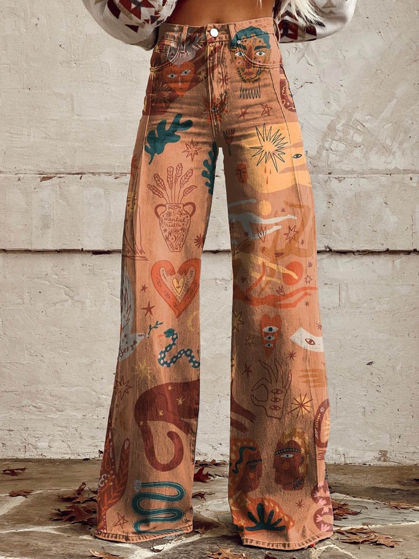 Women Casual Pants Imitation Jeans Wide Leg Digital Printed Diagonal Pant Flower