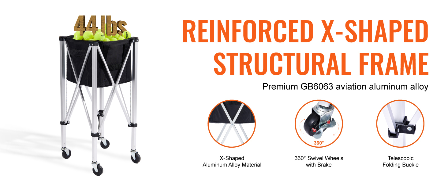 Made with lightweight aluminum alloy material, our tennis ball cart frame is sturdy yet easy to carry. It weighs just 6.6 pounds, like carrying 7 bottles of 500ml water, even girls can easily carry it.