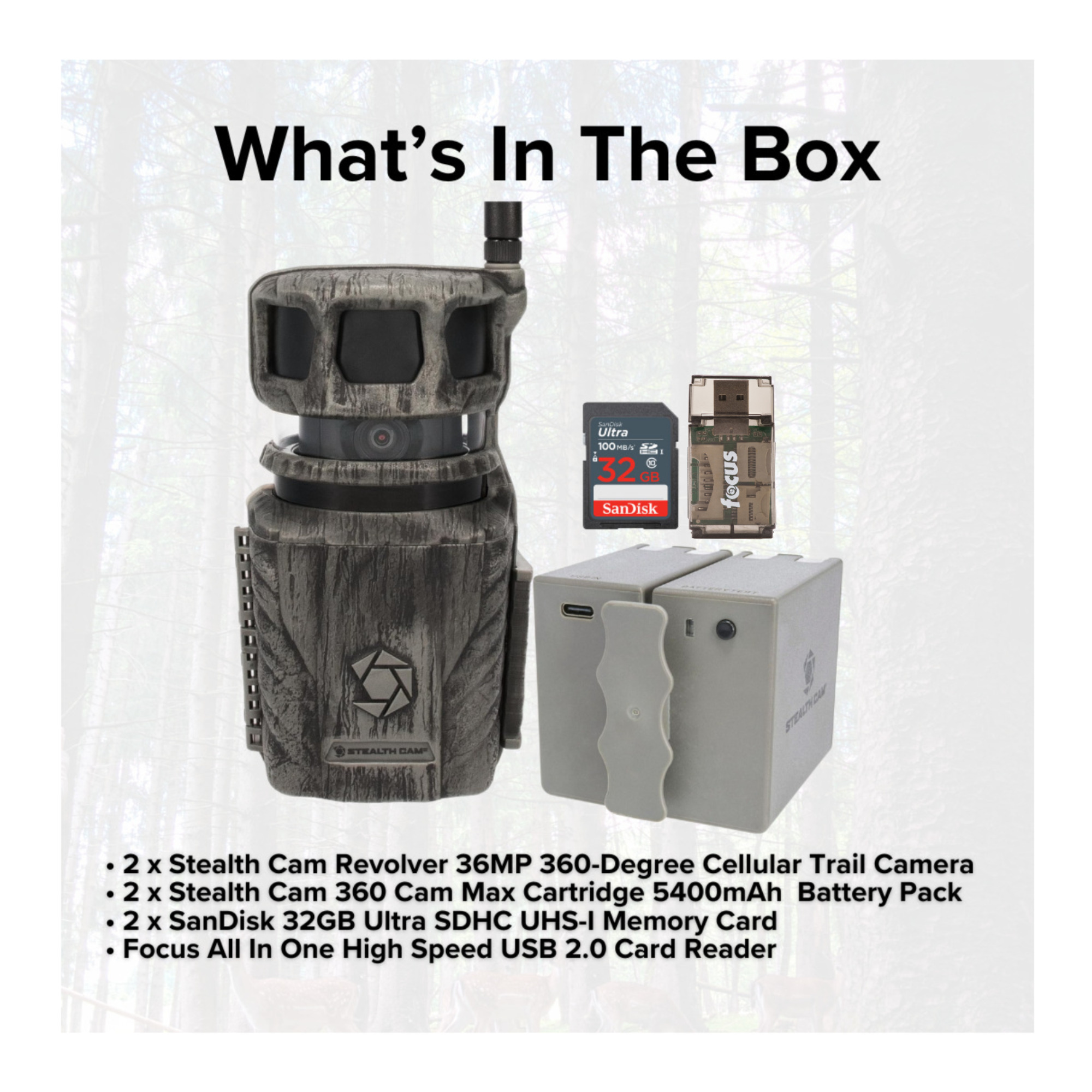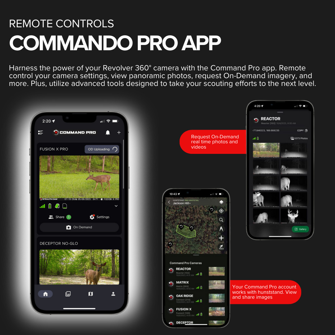 The all new Stealth Cam Revolver 36MP 360-Degree Cellular Trail Camera delivers the equivalent of six cameras worth of coverage in a single device capturing 4MP, 8MP, 16MP, and 36MP photos and 1080 HD video with audio via a revolutionary, 360-degree cellular model that covers six zones to deliver a complete panorama of its surroundings. This means users get a full 360 degrees of visibility, day and night, to ensure they never miss a thing even deer passing behind where the lens is positioned. Plus, thanks to its silent, pivoting motor, you can get more than just one photo from a single vantage when a zone is triggered. The camera responds quickly to deliver high-quality images and videos in real time, making it ideal for use on food plots. Choose from three photo operation settings, including: single-zone capture, 180-zone capture and 360-zone capture. Four power LEDs boast a whopping 80-foot detection range which, when paired with the 0.4-second trigger speed, burst mode and timelapse capabilities, provide reliable updates in real time, 24 x 7. Thanks to the integrated GPS, the camera shares its coordinates with you. Powered by a 16pc dual cartridge battery, it features a 1/4-inch threaded mount, 12V DC auxiliary jack and optional t-post mounting bracket (included). Includes Command Pro app compatibility.