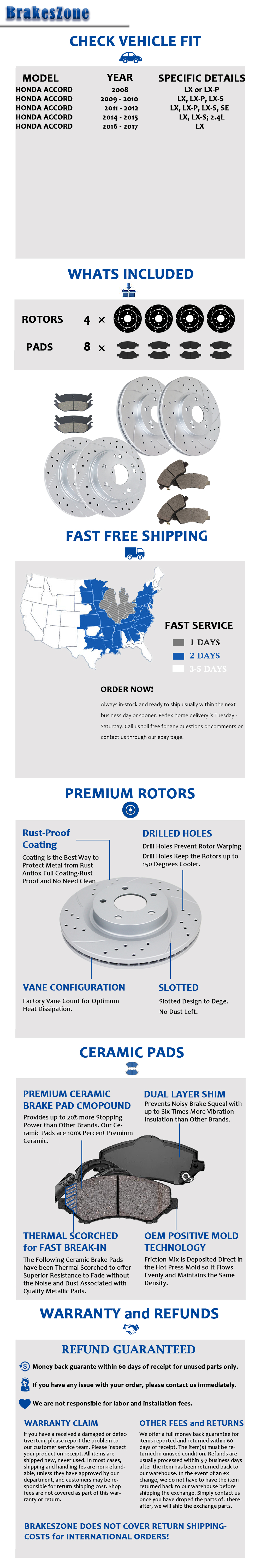 Front Rear Brake Rotors Pads for Honda Accord 2013 2.4L EX EX-L Drilled Slotted