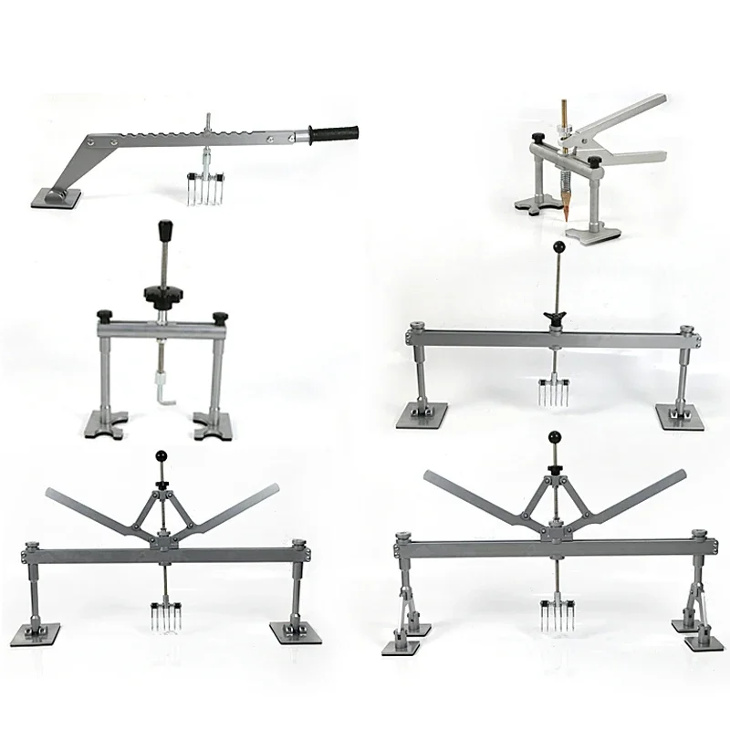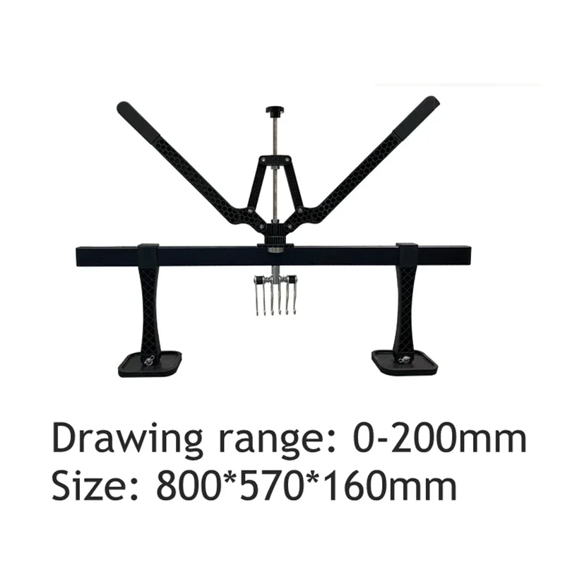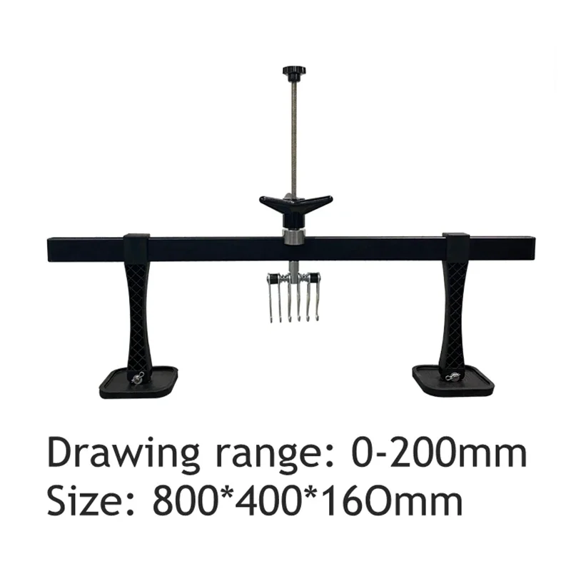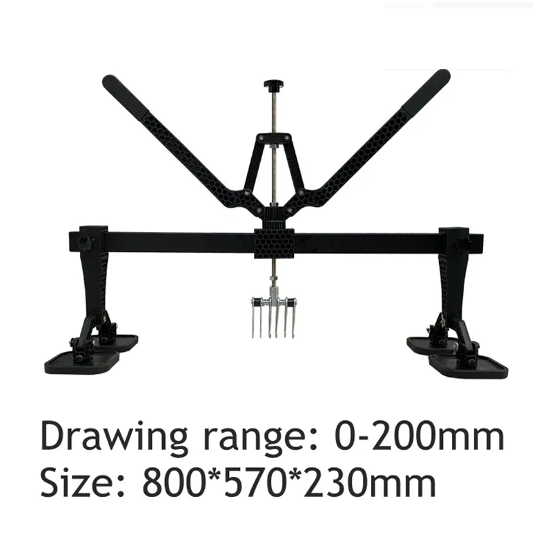 The double-pivot large pulling frame adopts the characteristics of the pulling arm lever, which ensures the power output of pulling; for the original body ribs, hardened areas of sheet metal processing and other original sheet metal repair technology is not easy to solve the difficult problems, it can be realised to carry out a one-time pulling and repairing, which fundamentally reduces the sheet metal repairing process and improves the efficiency. It can quickly pull up the recessed surfaces welded with mesons, studs or serpentine wires, and the two foot pads provide a solid support, which can provide a strong support force when pulling thick plates and large recessed areas.