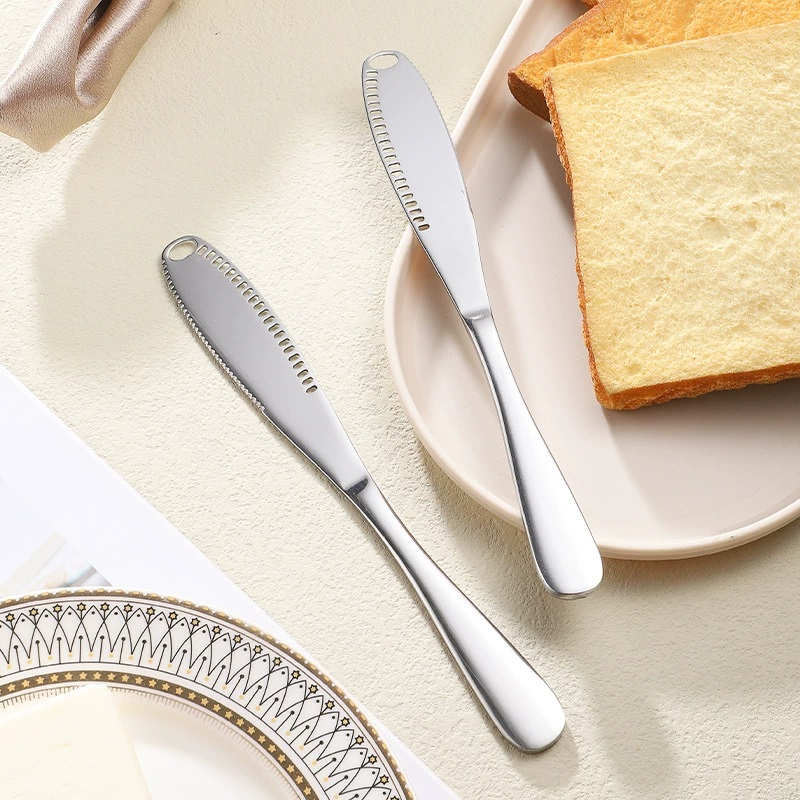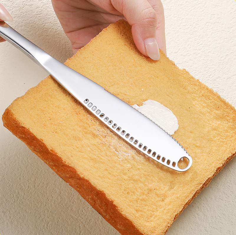 | 1. Large holes can be used for scraping thick silk, and uniform holes can be used for scraping fine silk. 2. Thickened handle design, smooth lines, more comfortable grip. 3. Sharp and even serrated edges, easy to cut butter and bread. 4. Made of stainless steel, durable, easy to clean. 5. Product thickening production, strong and not easy to damage, use without concern. |