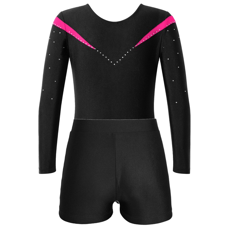 Long sleeve and v neckline leotard is decorated with shiny rhinestones, patchwork style.