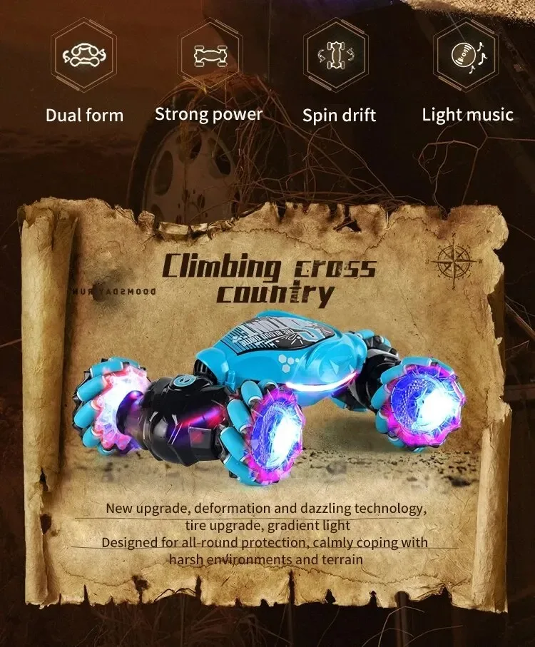 4. This RC car except basic function moving forward/backward, turn left/right. Special stunt features is including one-key transform, side drifting, 360° rotation, 2 sides driving, one-key to twist, one-key demonstrate, four-wheel drive climbing stunt car light music electric double-sided special effects toys.