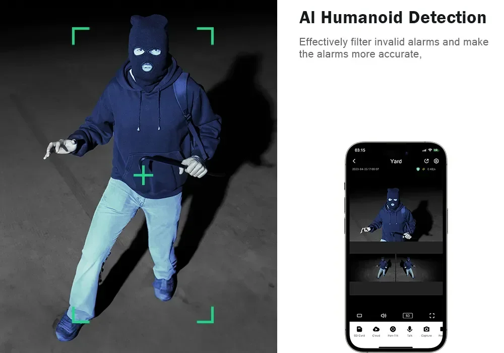 This security camera has intelligent AI detection function, supports AI humanoid automatic tracking and AI humanoid detection alarm, can accurately detect movements and send you notifications via APP.