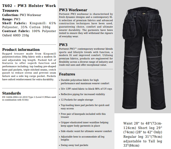 Contrast colour stitching. Contrast panels. Double rule pocket. Hammer loop. Reflective piping. Side pockets. Triple-stitched seams. Two back patch pockets. UPF 50+. Side elastic waist. Holster pockets. Gripper elastic on inner waist. Top-loading knee pad pockets. Smart phone pocket. D-ring. 12-pockets. Cargo pocket on side leg. Adjustable leg length. Reinforced panels . Durable polycotton fabric. WRAP certified. Oeko-Tex certified. Reach certified. SEDEX certified.