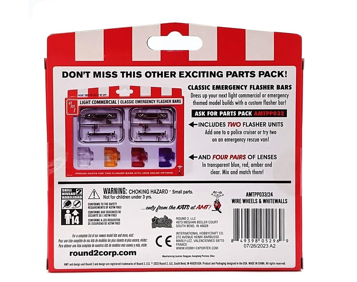 AMT's 1:25 Scale KH Wire Wheels & Tires Parts Pack. Features gleaming chrome wheels with spinner caps and wide whitewall, pad-printed vinyl tires. Works with many vintage muscle, custom and street rod car kits. Making it perfect for any modeler looking to customize their next build with wire wheels and wide whitewall tires!