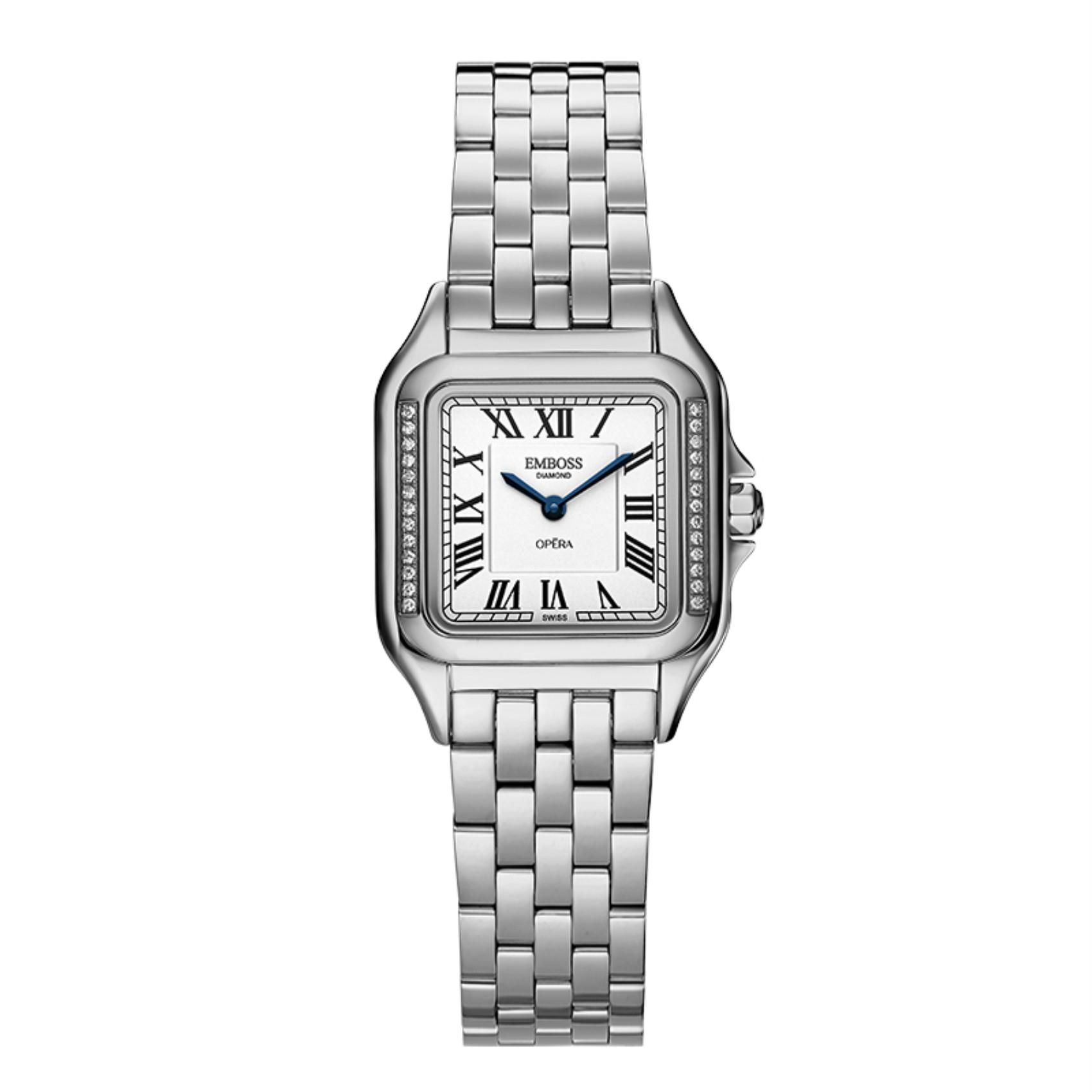 The EMBOSS Opera Diamond watch is an exquisite Swiss-made timepiece featuring a 316L stainless steel case and bracelet, ensuring durability and hypoallergenic properties. The case is set with 26 diamonds (SI clarity, H color) totaling 0.13 carats, adding a touch of elegance. Powered by the reliable SWISS MADE RONDA SLIMTECH 1062 movement, it offers precision and longevity. Protected by a scratch-resistant Sapphire Crystal, this luxury watch is also water-resistant up to 100 meters.