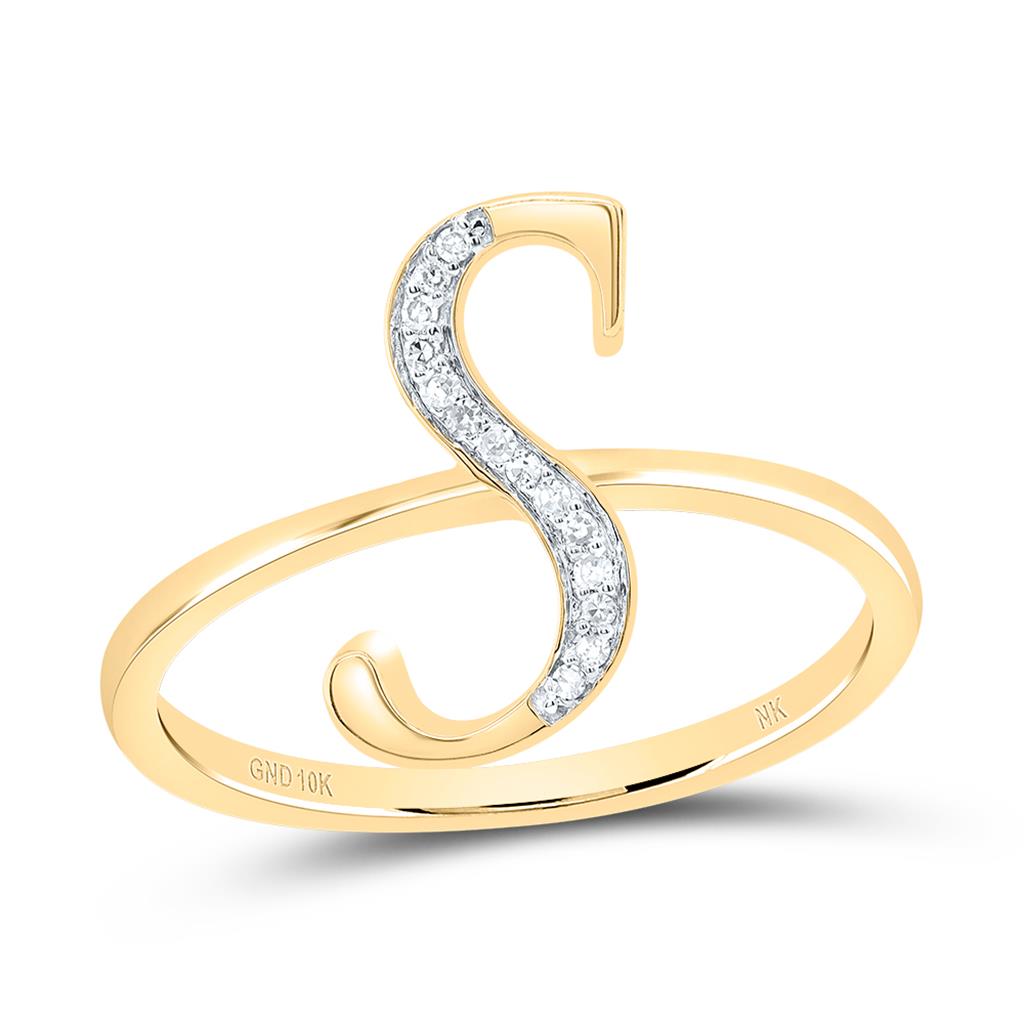 (1.74 gr. of 10k Yellow Gold | Total Carat Weight: 0.05 ct. t.w. of White Diamonds | Width: 15mm | Clarity: I1 - I2 | Color: H - I | Women's Round Cut Diamond Script Font Initial S Stackable Band Ring)