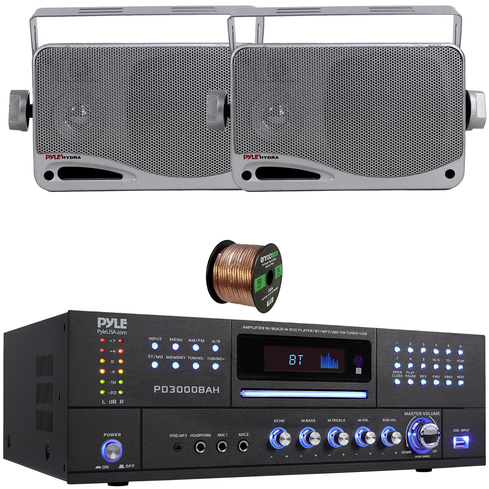 Pyle PD3000BAH 4-Channel 4000W Bluetooth Home Audio Amplifier Receiver – HDMI, USB, FM Radio, CD/DVD Player 2 Microphone, 2x 3.5'' 200W Max Power 3-Way Weather Proof Mini Box Silver Speakers W/Wire