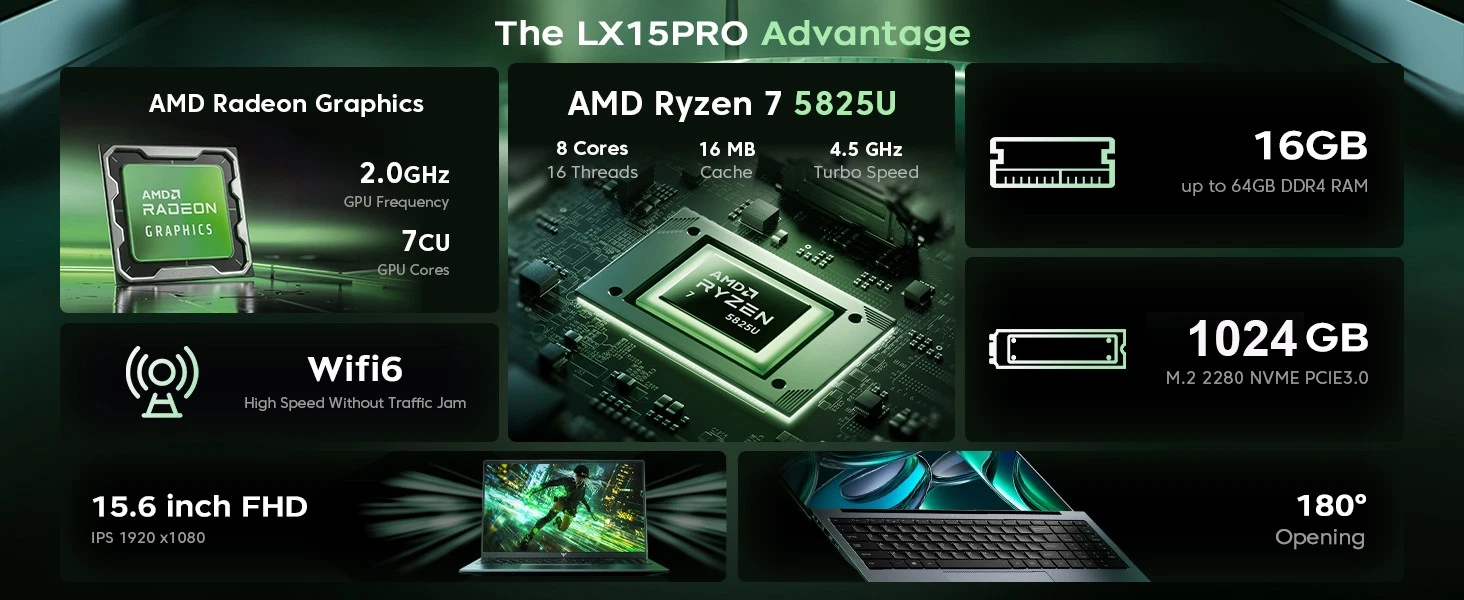 When it comes to processing, the integrated AMD Radeon Graphics deliver powerful graphics processing while providing an exceptional visual experience with photorealistic graphics and incredibly fast performance. Whether you're gaming, editing multimedia projects, or handling productivity tasks, the LX15PRO gaming laptop offers the power and versatility to enhance your computing capabilities.