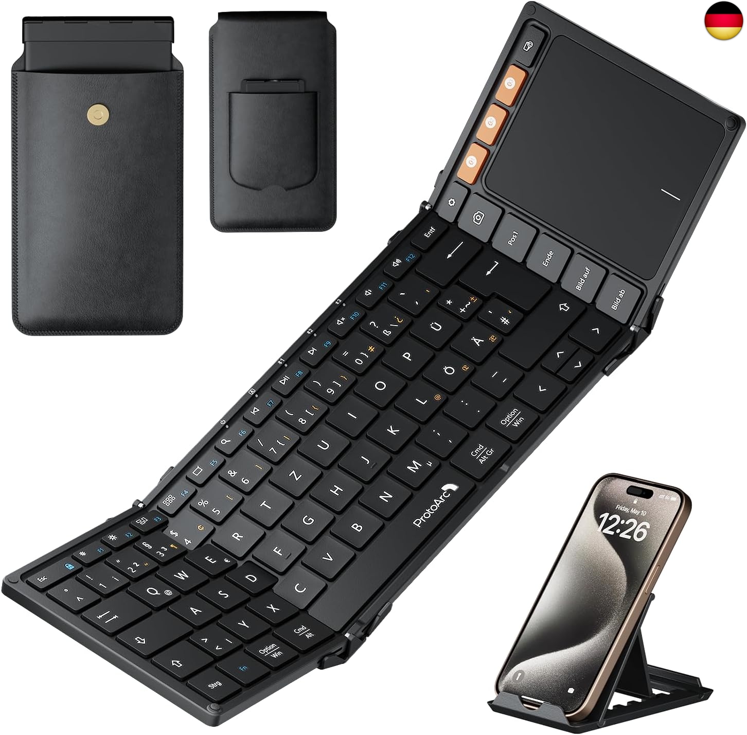 ProtoArc XK01 TP Bluetooth Tastatur Faltbare mit Touchpad, Tastatur Kabellos Klappbare QWERTZ Deutsch mit Trackpad, iPad Tastatur für iOS, Android, Windows Laptop PC Tablet - Schwarz