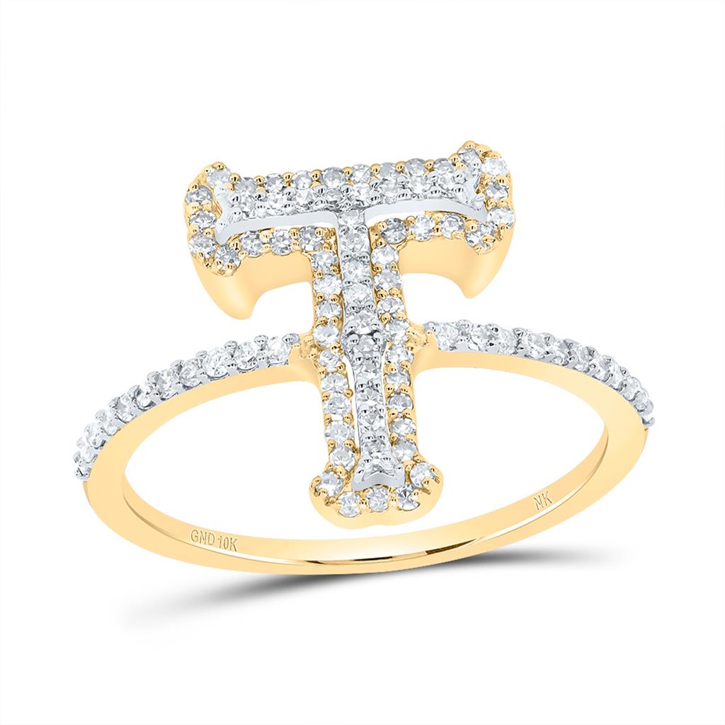 (1.96 gr. of 10k Yellow Gold | Total Carat Weight: 0.38 ct. t.w. of White Diamonds | Width: 15.5mm | Clarity: I1 - I2 | Color: H - I | Women's Round Cut Diamond Tiered Block Font Initial T Stackable Band Ring)