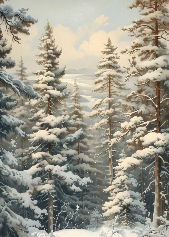 Immerse yourself in the quiet beauty of this winter-themed art print featuring a vast pine forest blanketed in snow. With soft sunlight filtering through clouds and trees, this artwork captures the serene stillness of nature during winter’s peak. It's a perfect addition for calm and cozy interiors.