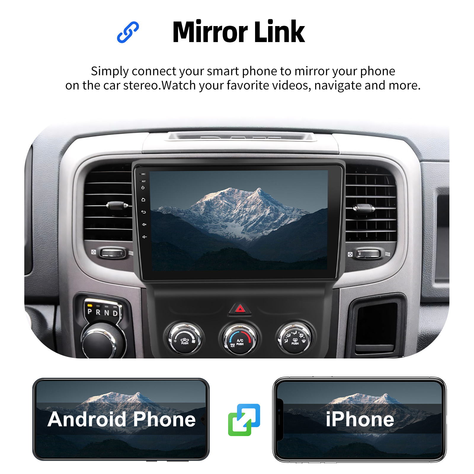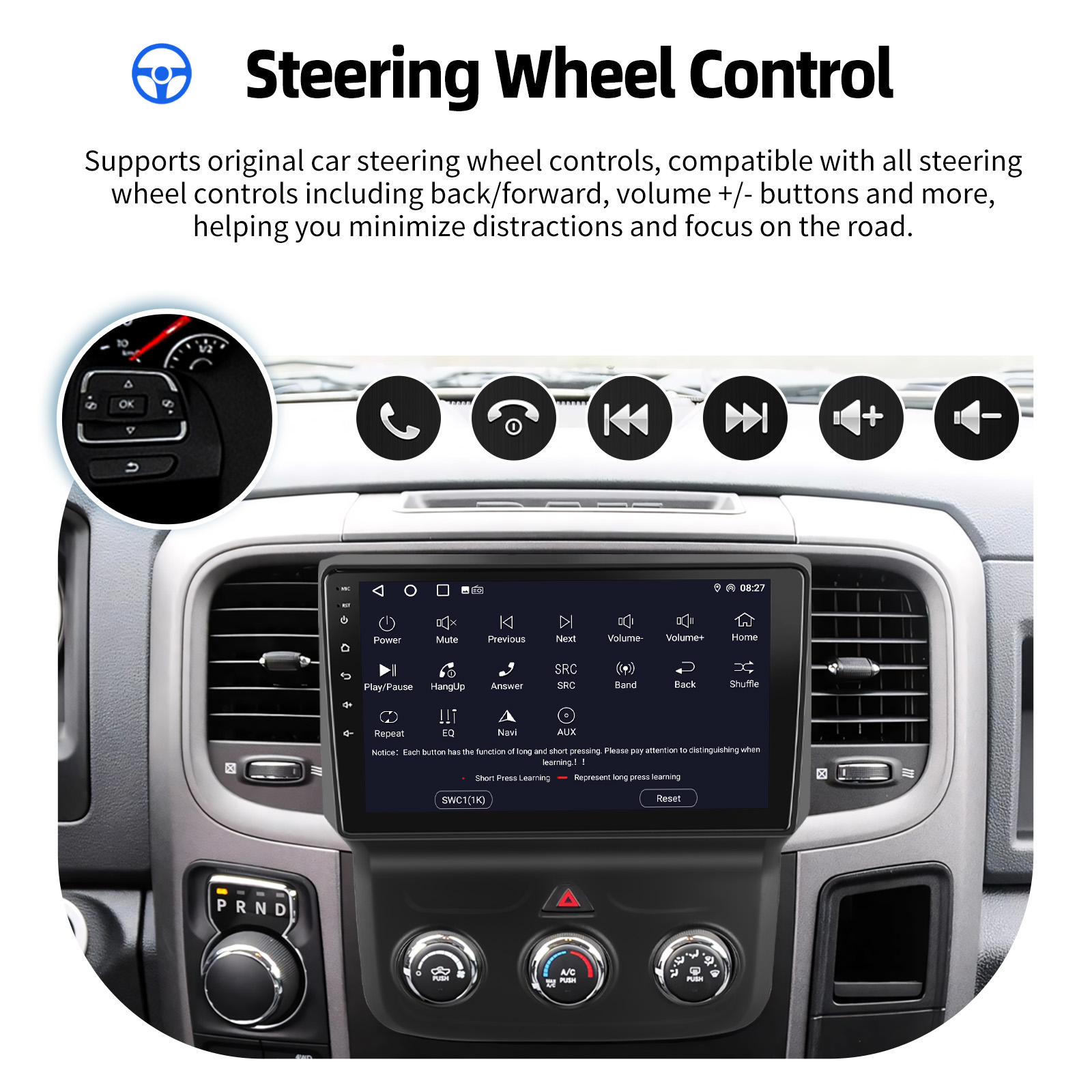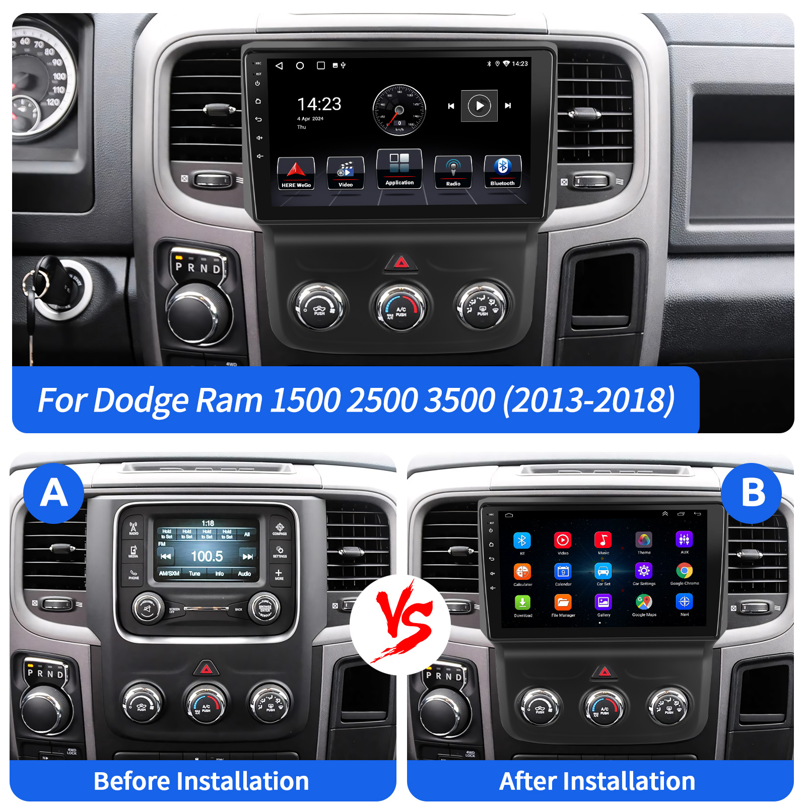 9 Inch Android 15 Car Radio For Dodge Ram 1500 2500 3500 : The Android car radio with 9" 1280*720 HD capacitive touch screen, 4GB RAM and 64GB ROM allows you to download your favorite apps and videos, so that driving will never be boring .No additional frame, no cable change, plug and play.
